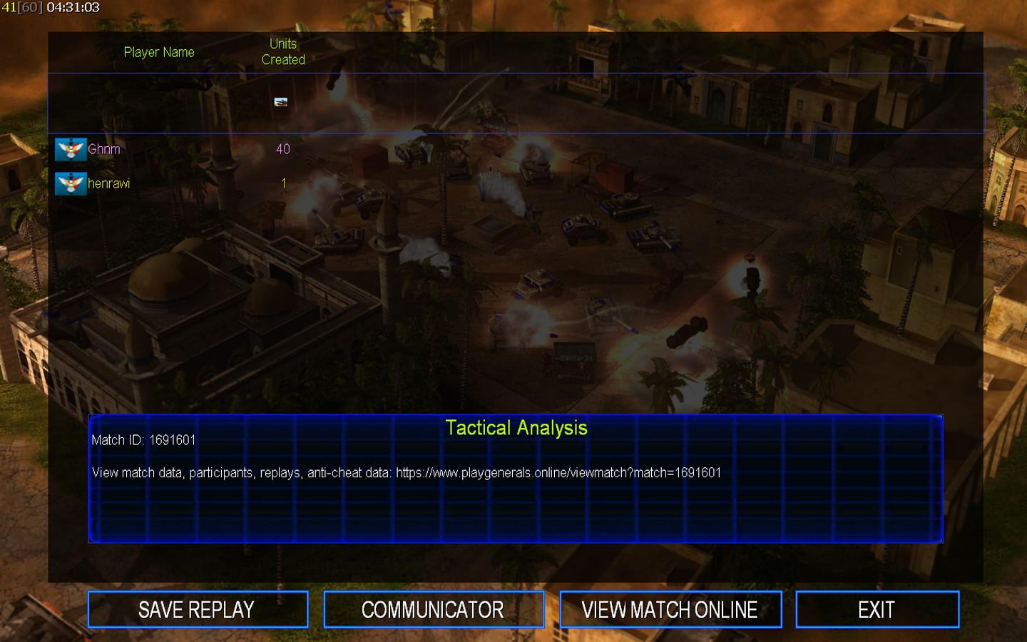 | Name | Side | Color | Team | Starting Position | Buildings Built | Buildings Lost | Buildings Destroyed | Units Built | Units Lost | Units Destroyed | Money Earned | Outcome |