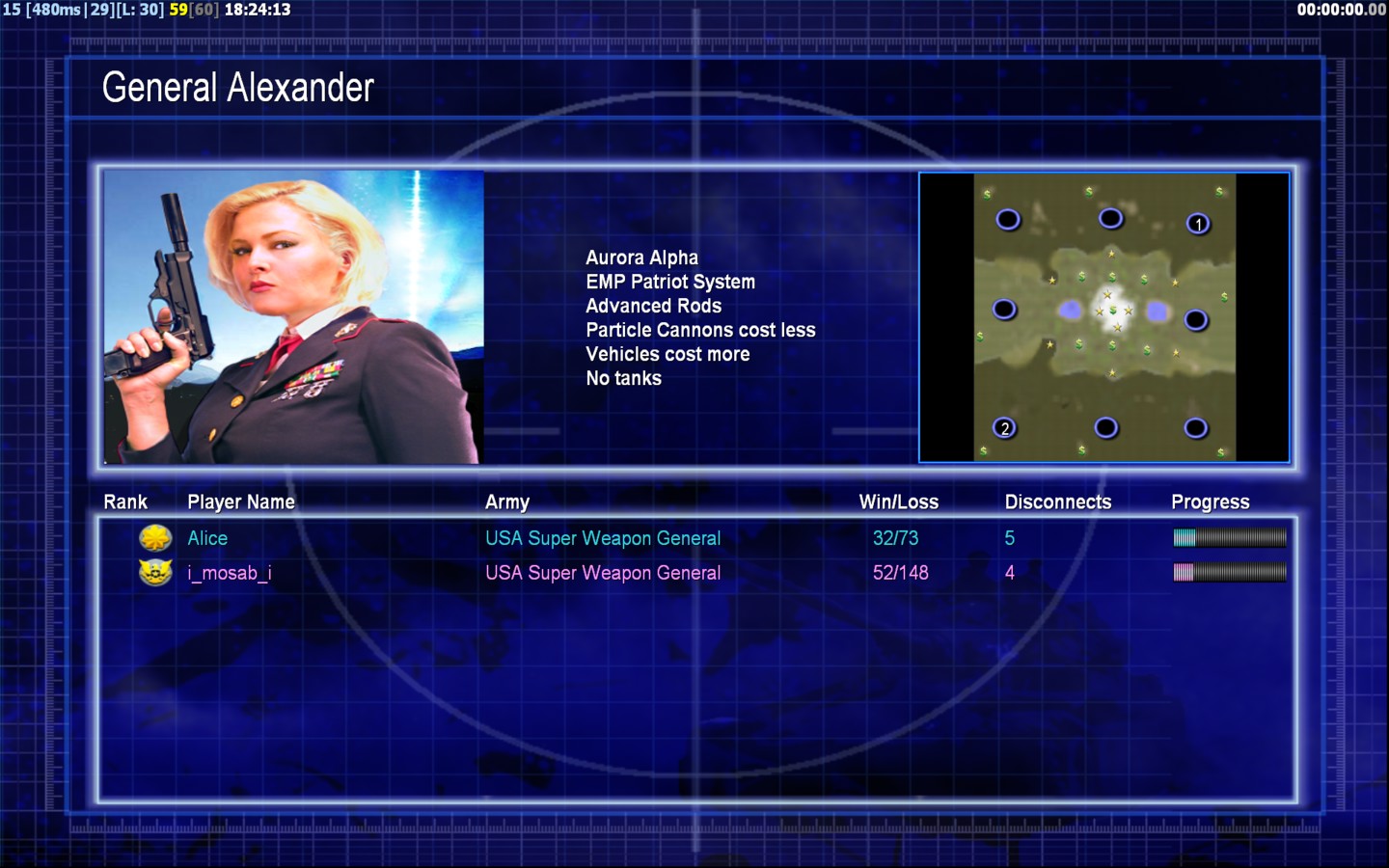 Color | TeamNone | Starting Position6 | Buildings Built24 | Buildings Lost9 | Buildings Destroyed1 | Units Built46 | Units Lost41 | Units Destroyed14 | Money Earned21000 | OutcomeLost |