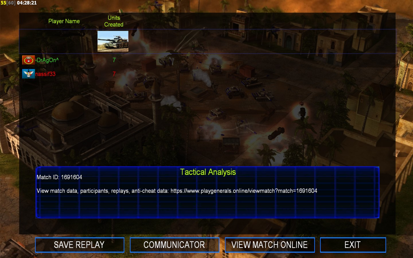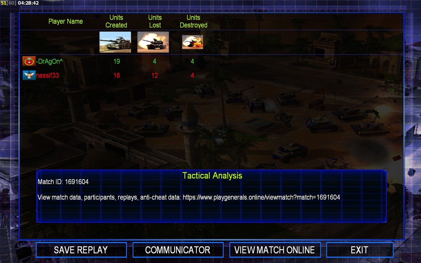 | Name | Side | Color | Team | Starting Position | Buildings Built | Buildings Lost | Buildings Destroyed | Units Built | Units Lost | Units Destroyed | Money Earned | Outcome |