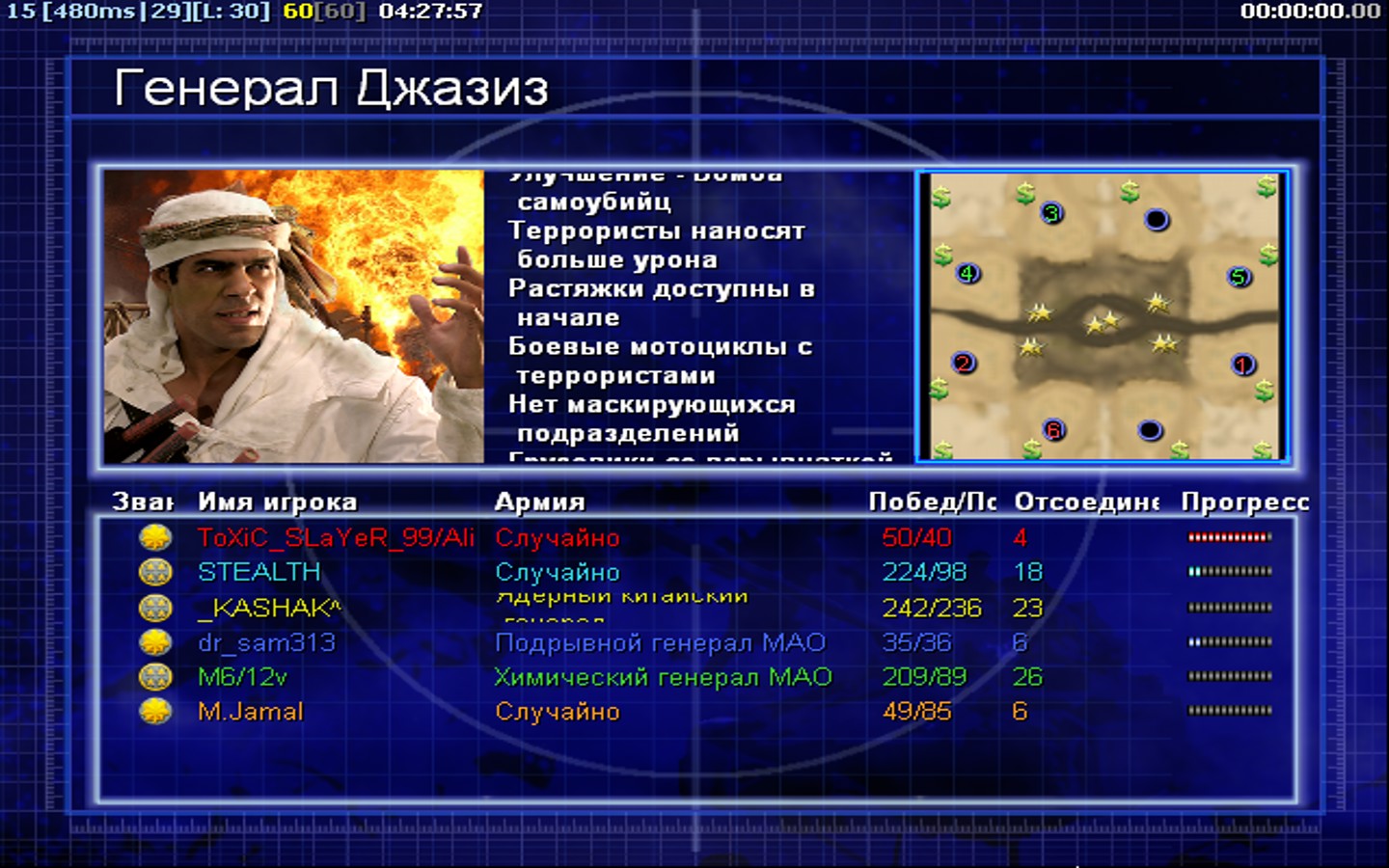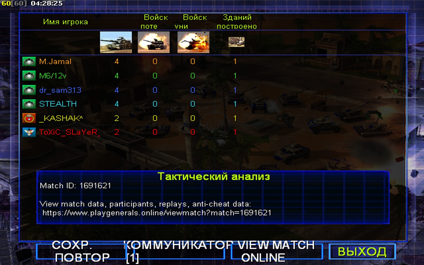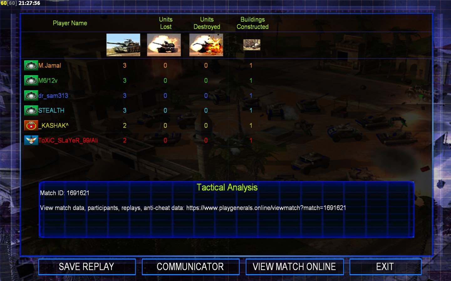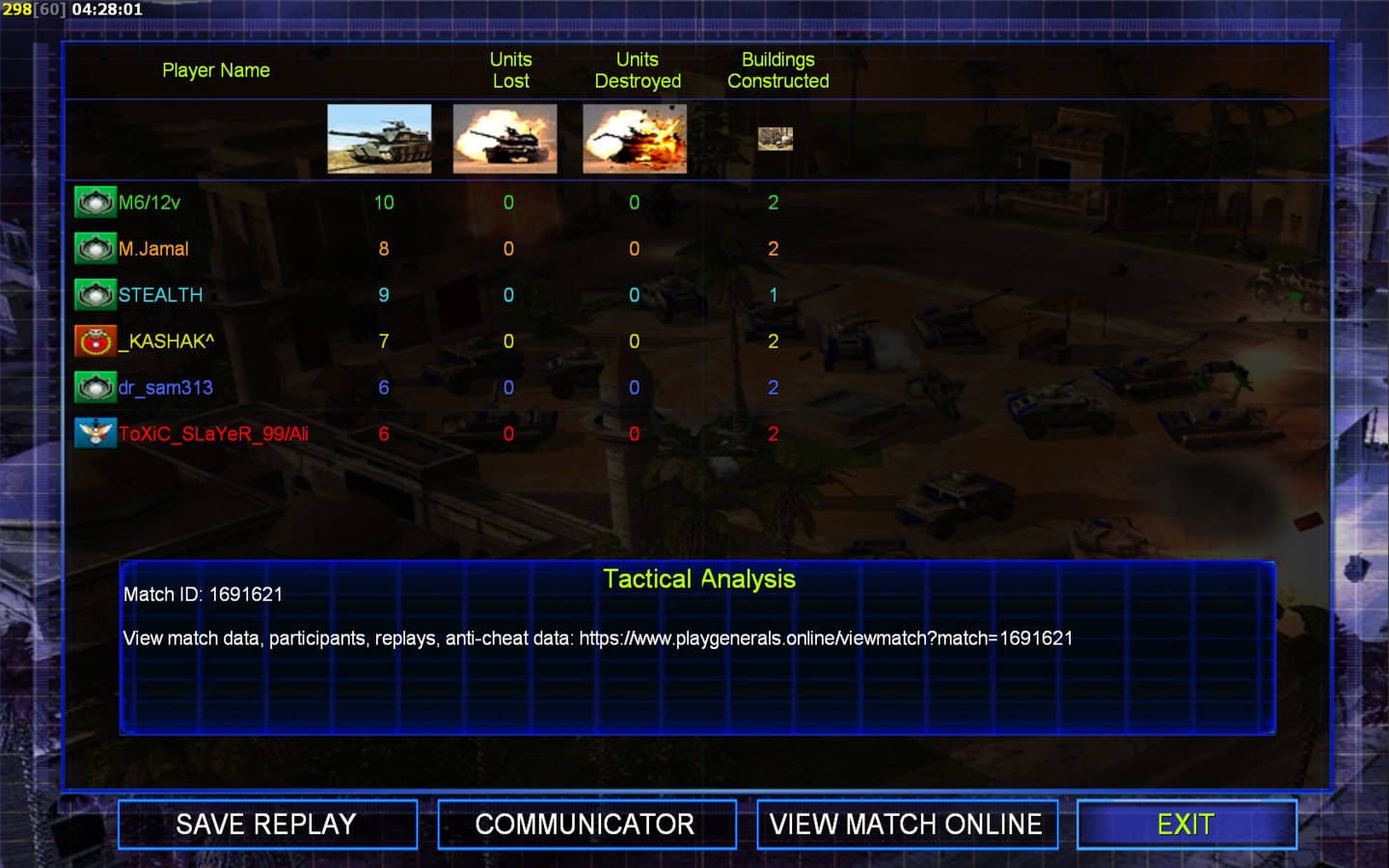 | Name | Side | Color | Team | Starting Position | Buildings Built | Buildings Lost | Buildings Destroyed | Units Built | Units Lost | Units Destroyed | Money Earned | Outcome |