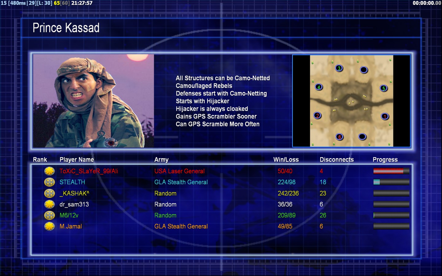 | NameSTEALTH | Side | Color | Team0 | Starting Position7 | Buildings Built1 | Buildings Lost0 | Buildings Destroyed0 | Units Built3 | Units Lost0 | Units Destroyed0 | Money Earned0 | OutcomeLost |