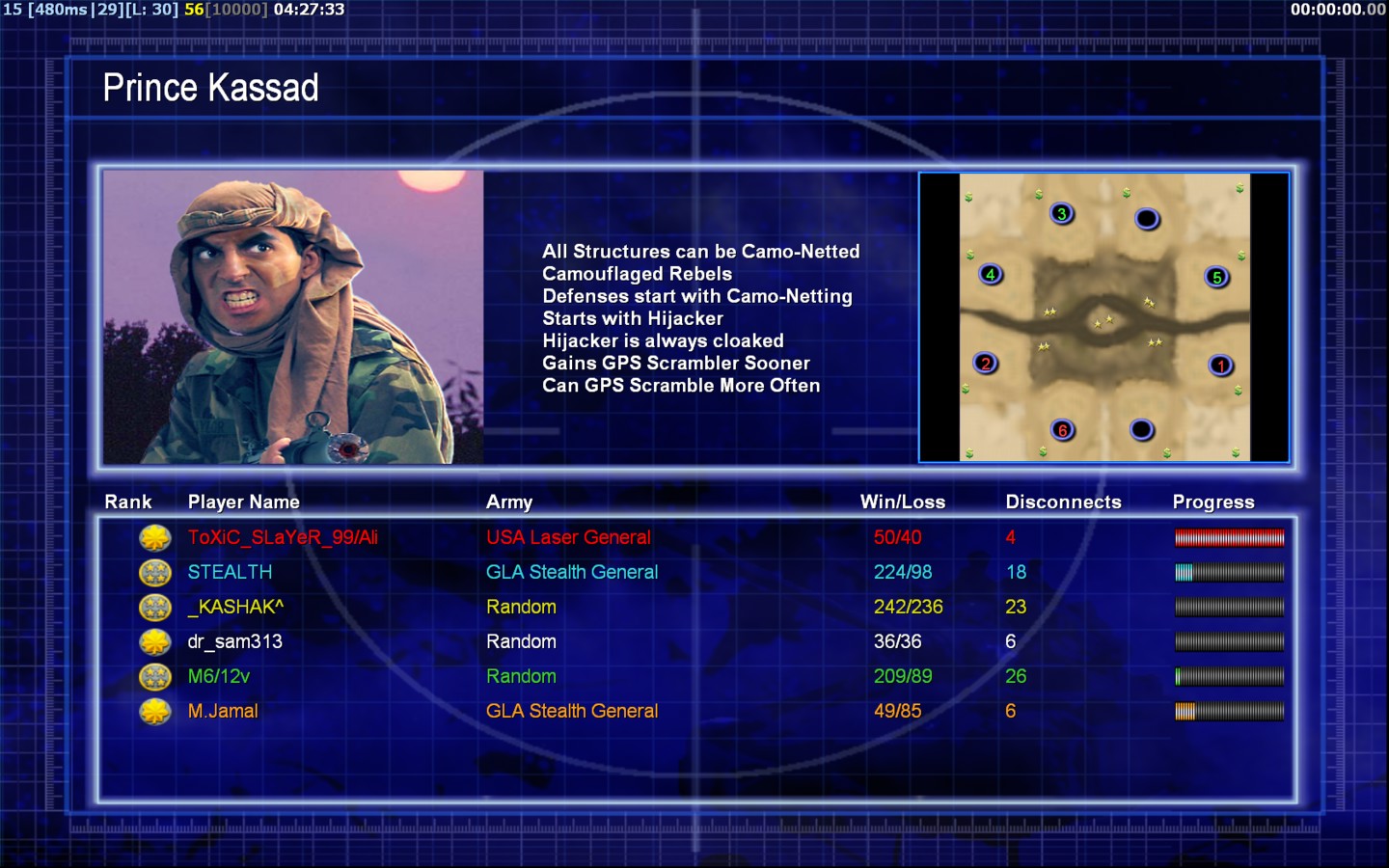 | NameM.Jamal | Side | Color | Team0 | Starting Position6 | Buildings Built2 | Buildings Lost0 | Buildings Destroyed0 | Units Built8 | Units Lost0 | Units Destroyed0 | Money Earned75 | OutcomeLost |