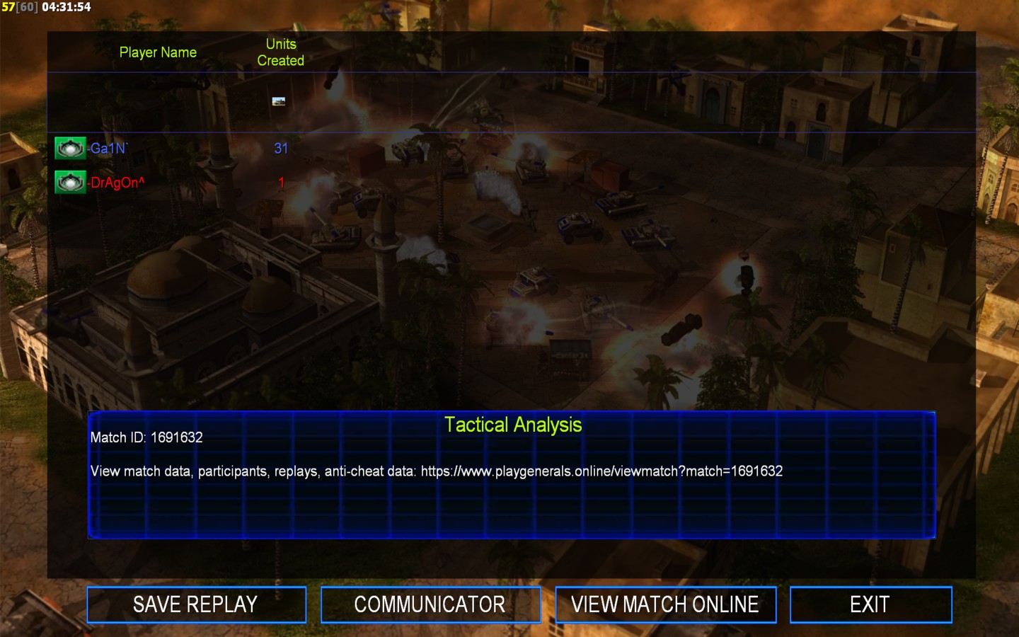 | Name | Side | Color | Team | Starting Position | Buildings Built | Buildings Lost | Buildings Destroyed | Units Built | Units Lost | Units Destroyed | Money Earned | Outcome |