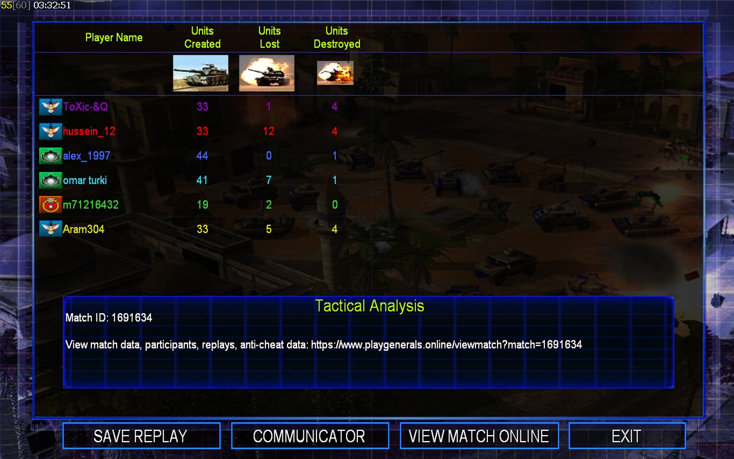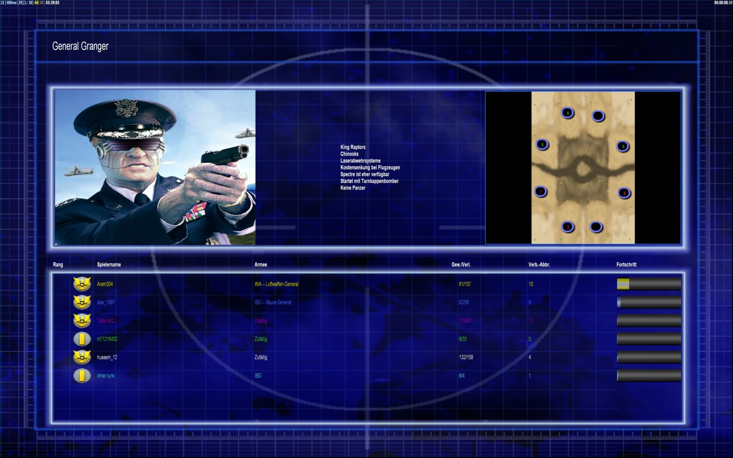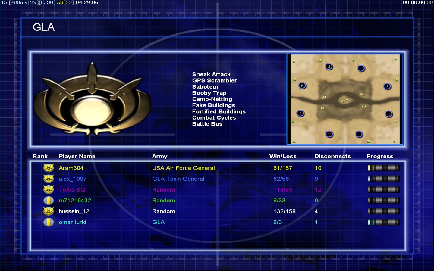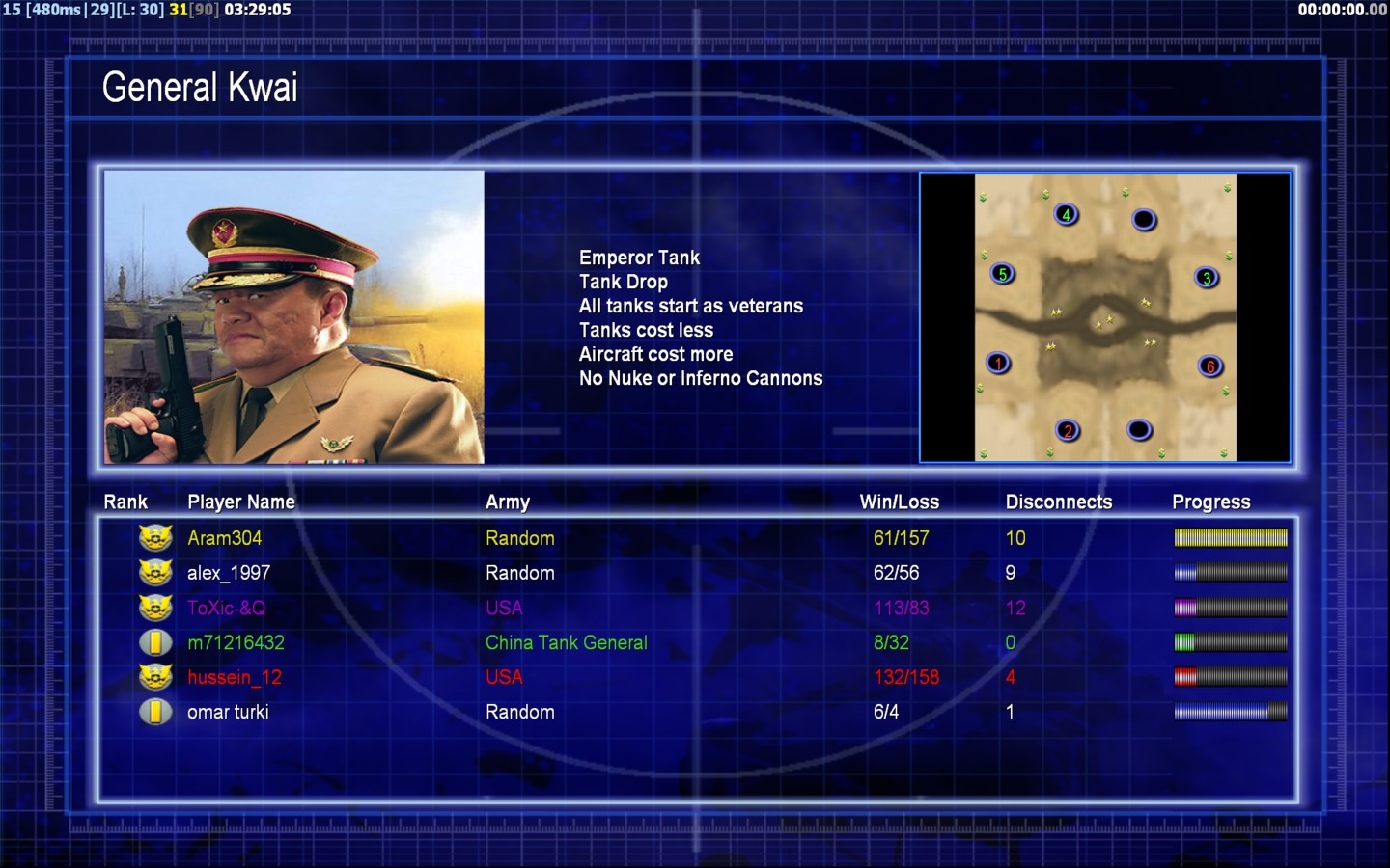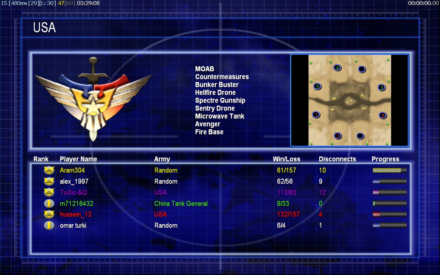 | Nameomar turki | Side | Color | Team0 | Starting Position4 | Buildings Built11 | Buildings Lost0 | Buildings Destroyed0 | Units Built44 | Units Lost11 | Units Destroyed3 | Money Earned6600 | OutcomeWon |
