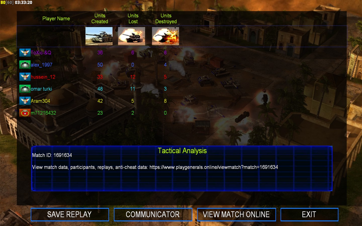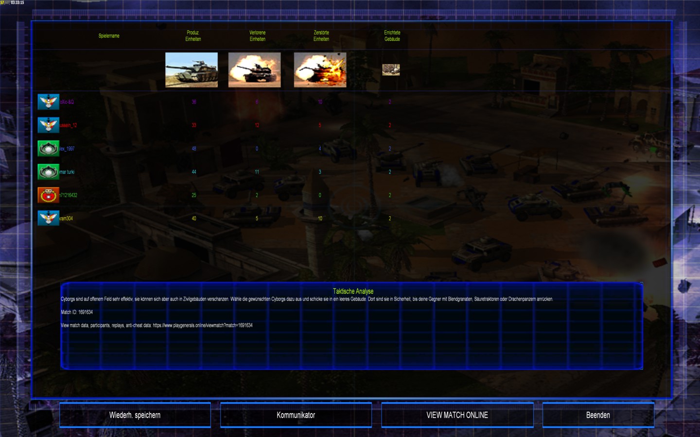 | Name | Side | Color | Team | Starting Position | Buildings Built | Buildings Lost | Buildings Destroyed | Units Built | Units Lost | Units Destroyed | Money Earned | Outcome |