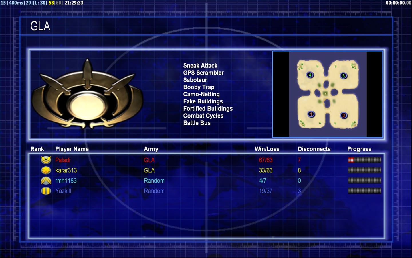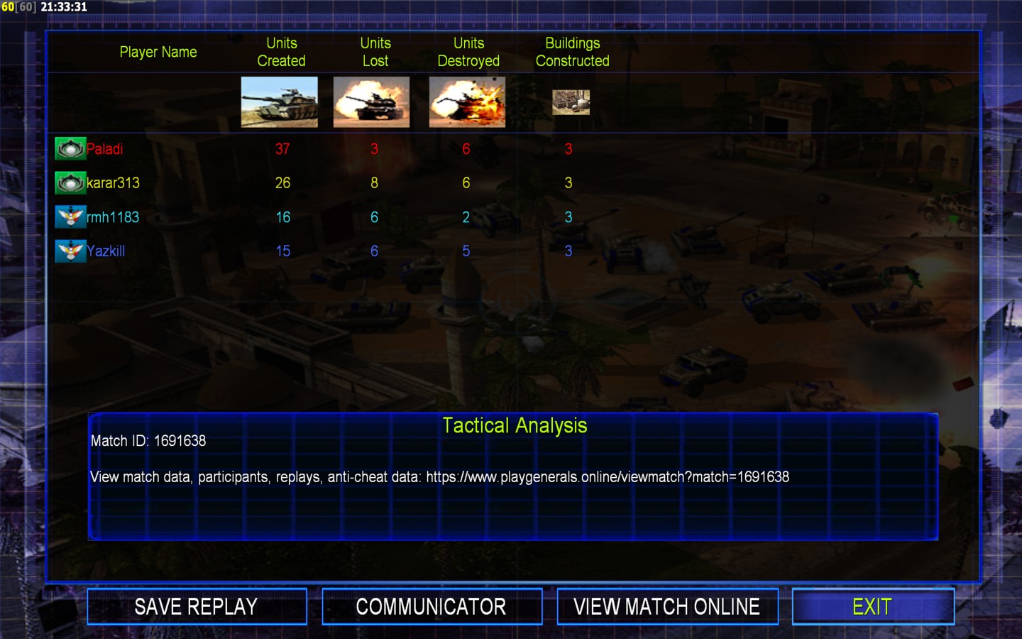 | NamePaladi | Side | Color | Team0 | Starting Position1 | Buildings Built11 | Buildings Lost0 | Buildings Destroyed0 | Units Built37 | Units Lost3 | Units Destroyed6 | Money Earned16298 | OutcomeWon |