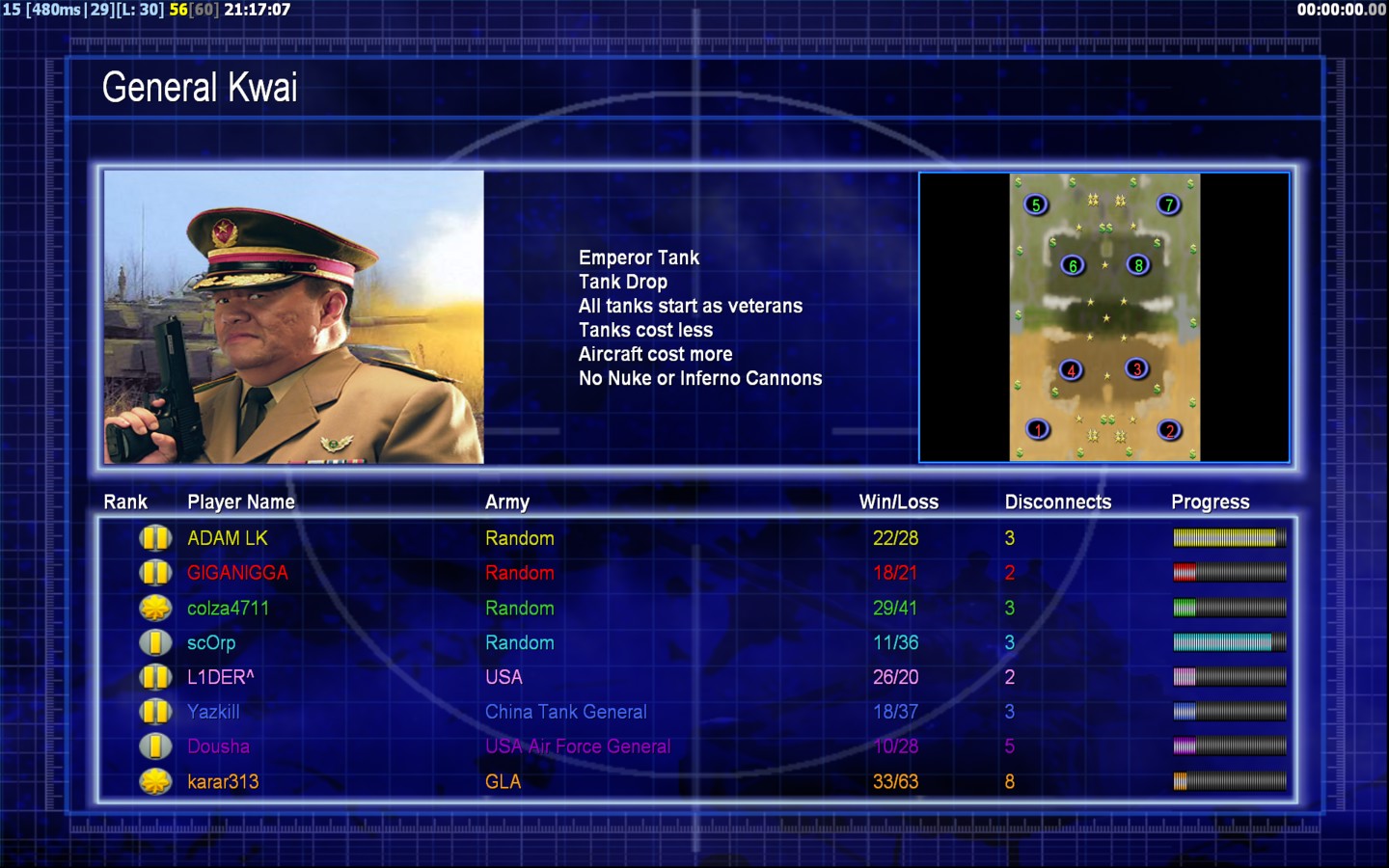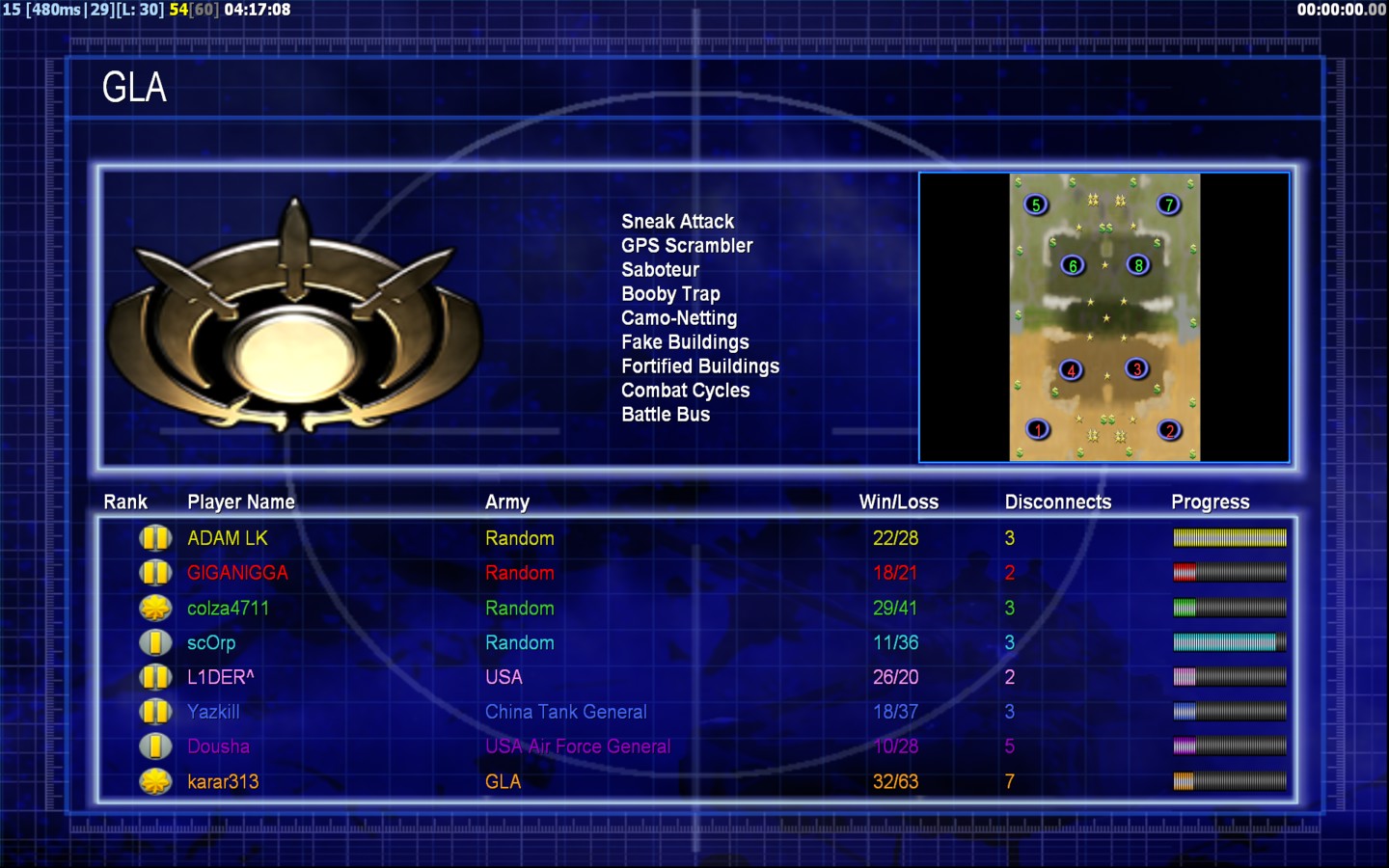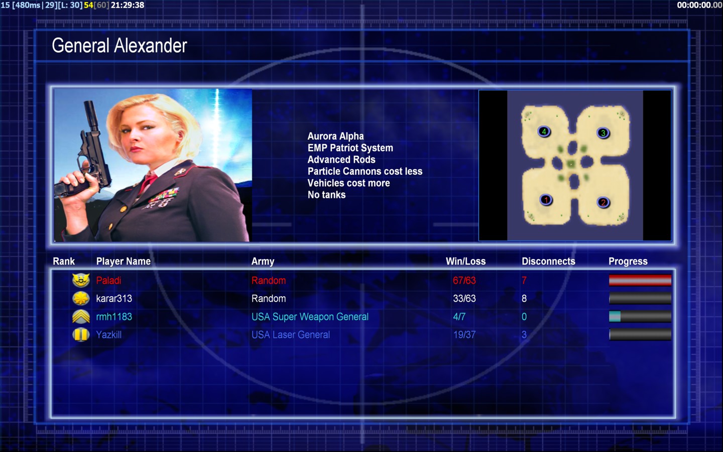 | Namekarar313 | Side | Color | Team0 | Starting Position2 | Buildings Built8 | Buildings Lost0 | Buildings Destroyed1 | Units Built27 | Units Lost8 | Units Destroyed6 | Money Earned13325 | OutcomeWon |
