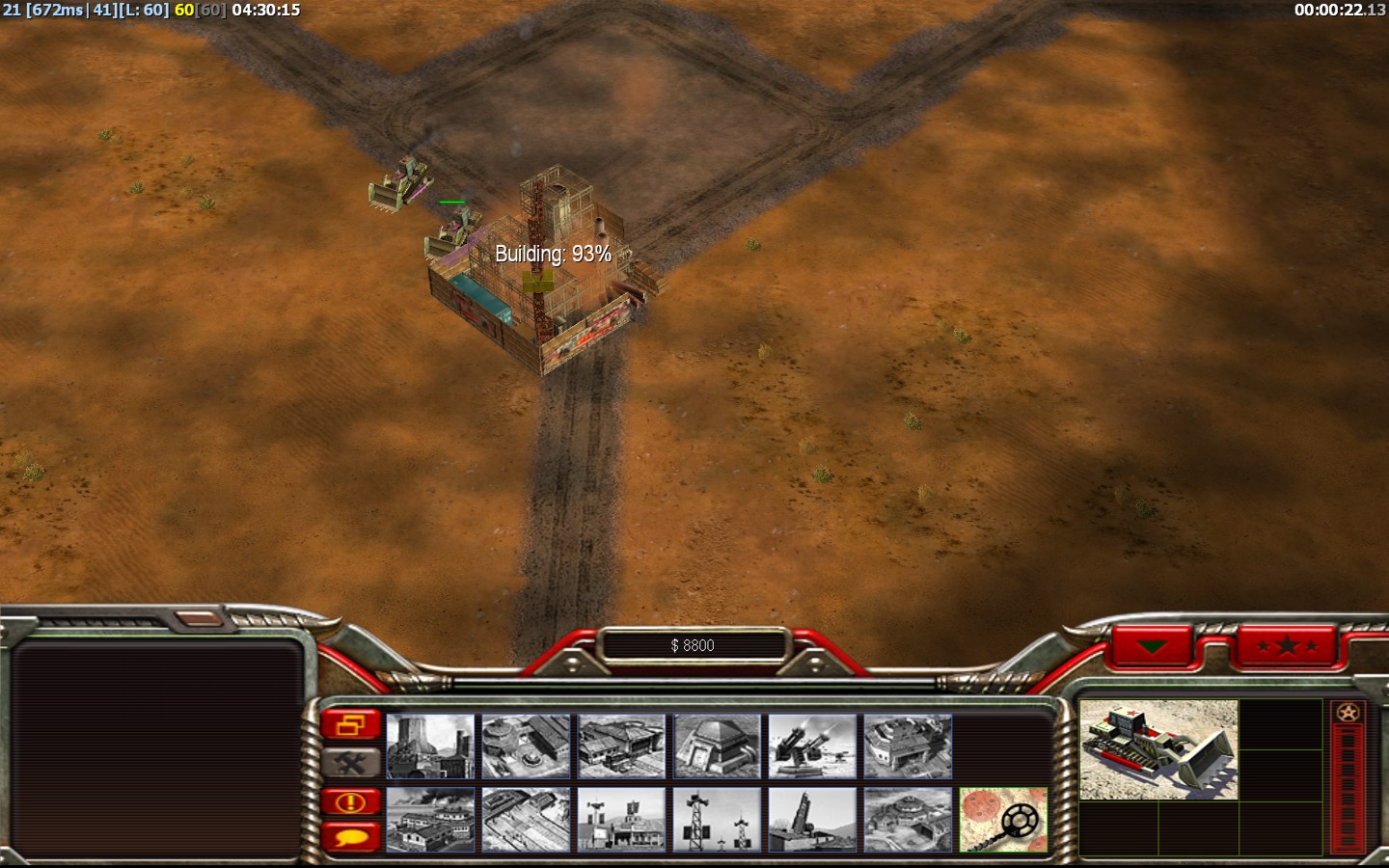 Color | TeamNone | Starting PositionNone | Buildings Built6 | Buildings Lost5 | Buildings Destroyed1 | Units Built15 | Units Lost15 | Units Destroyed8 | Money Earned7200 | OutcomeLost |