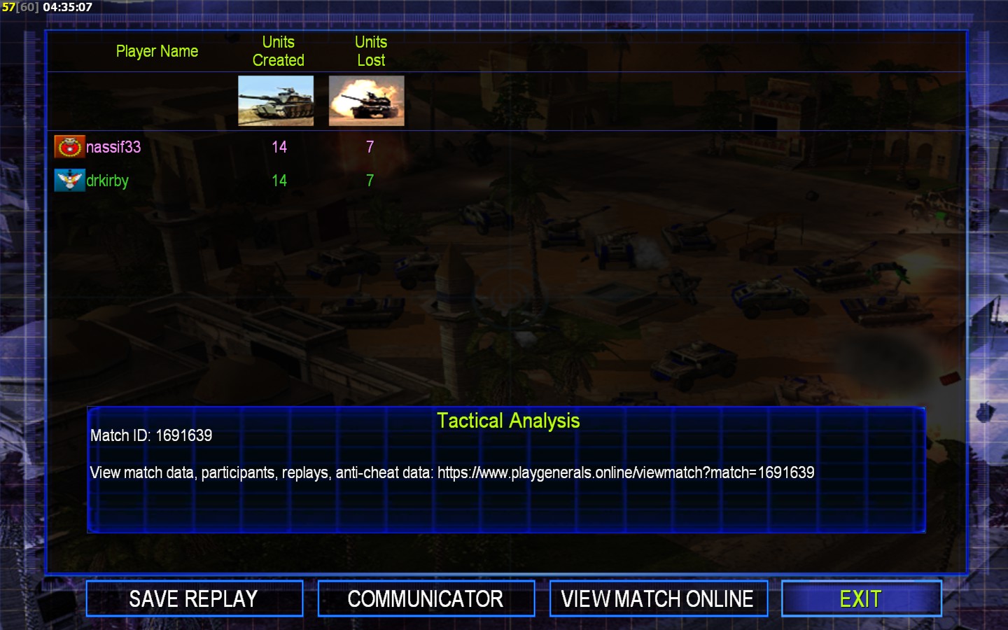 | Name | Side | Color | Team | Starting Position | Buildings Built | Buildings Lost | Buildings Destroyed | Units Built | Units Lost | Units Destroyed | Money Earned | Outcome |