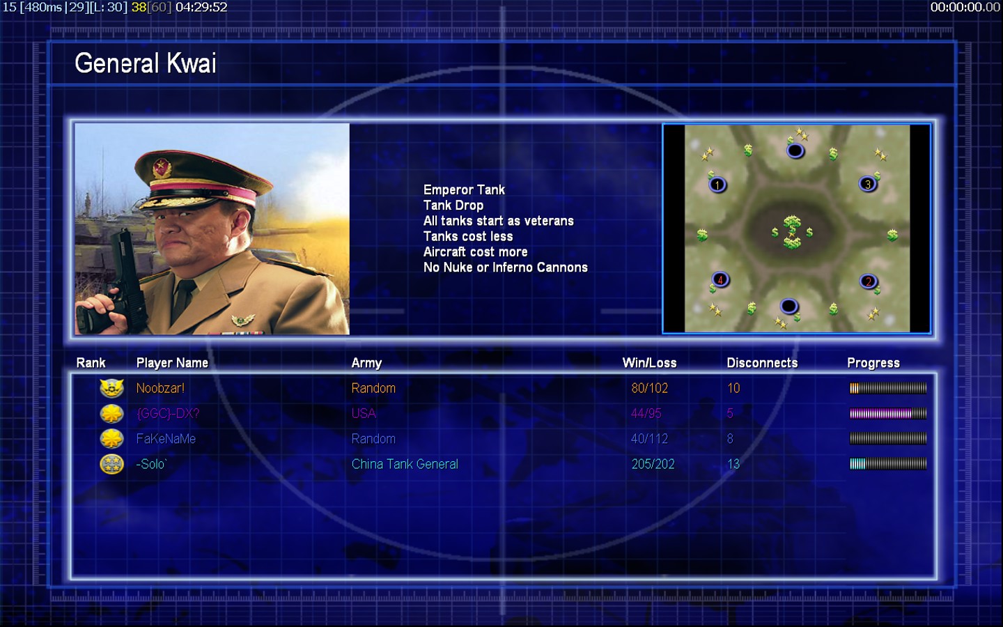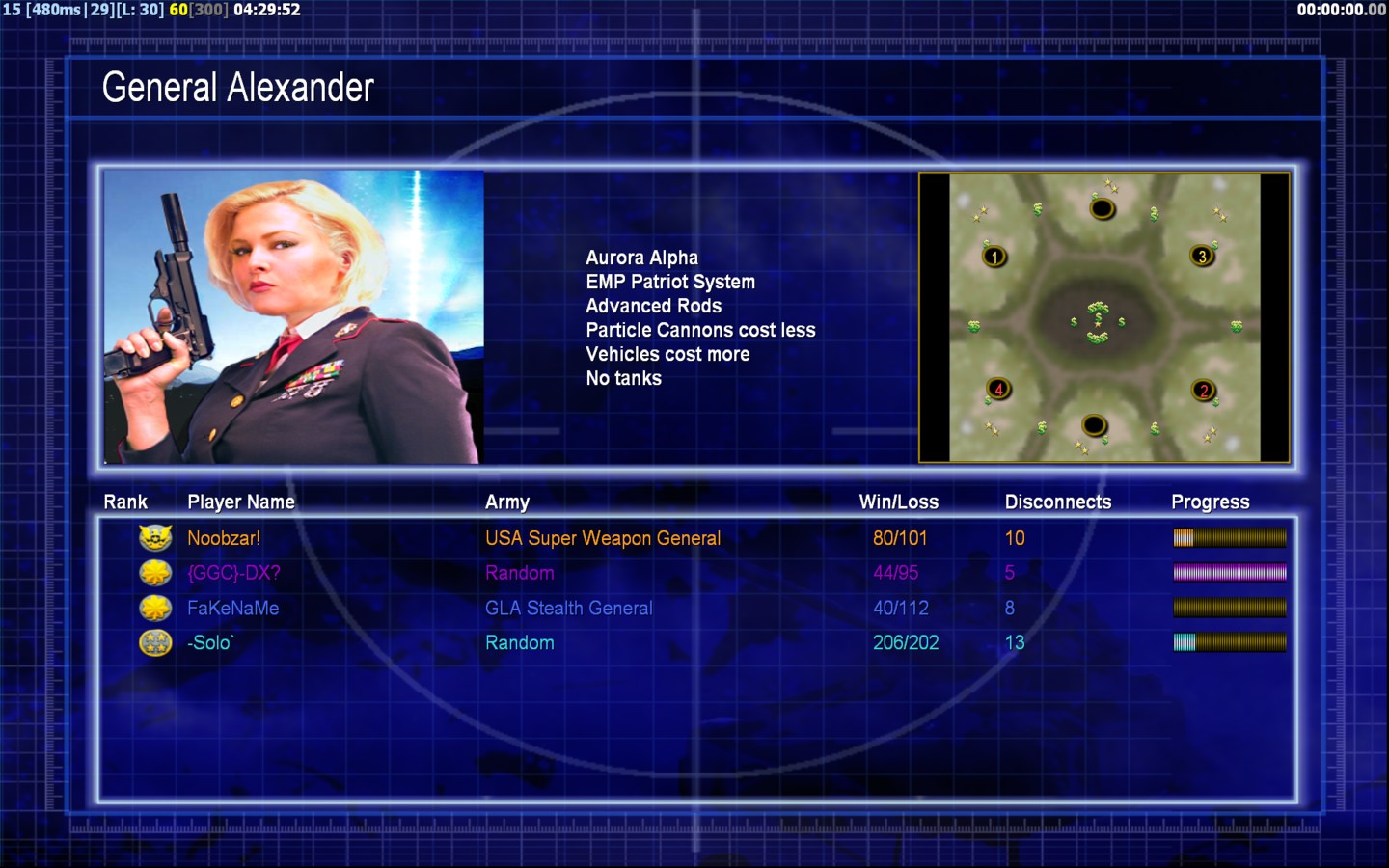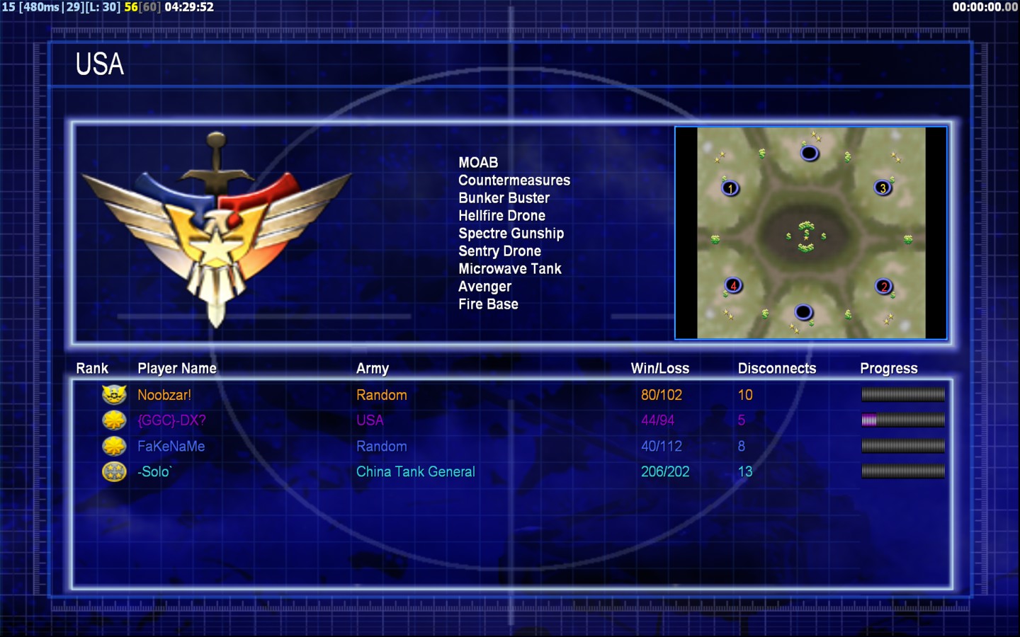 | NameFaKeNaMe | Side | Color | Team3 | Starting Position0 | Buildings Built29 | Buildings Lost6 | Buildings Destroyed0 | Units Built104 | Units Lost74 | Units Destroyed80 | Money Earned77062 | OutcomeLost |