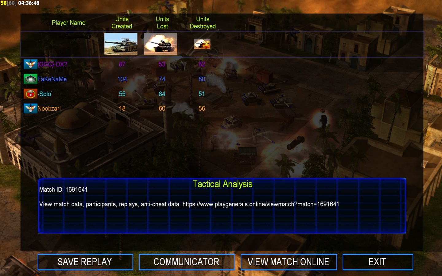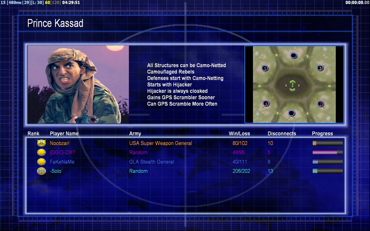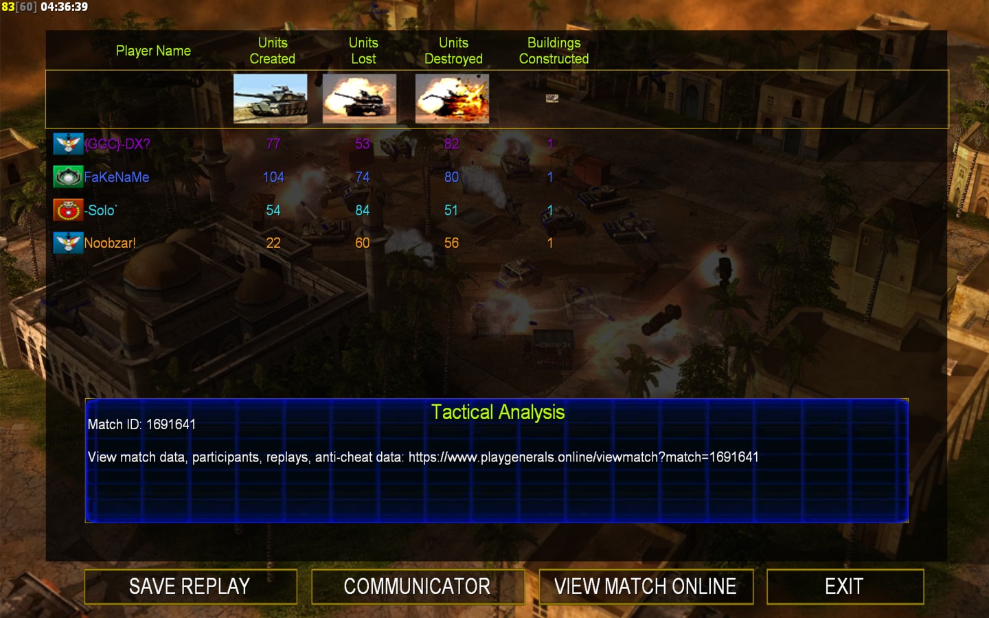 | NameFaKeNaMe | Side | Color | Team3 | Starting Position0 | Buildings Built29 | Buildings Lost6 | Buildings Destroyed0 | Units Built104 | Units Lost74 | Units Destroyed80 | Money Earned77062 | OutcomeLost |
