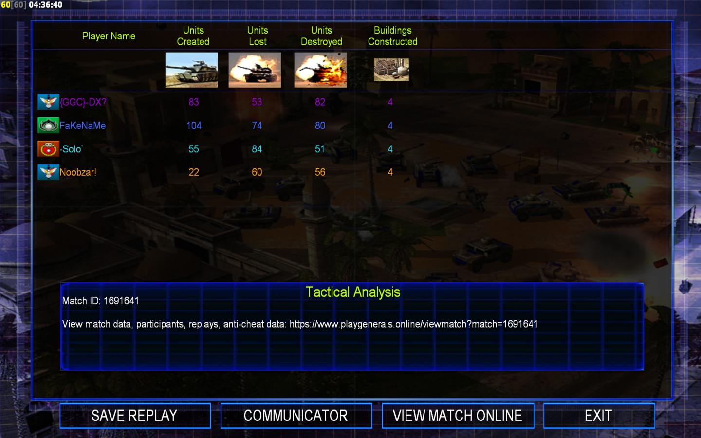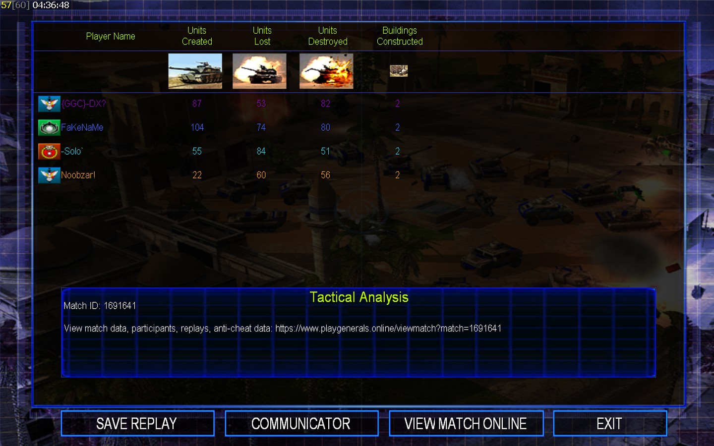 | Name{GGC}-DX? | Side | Color | Team0 | Starting Position1 | Buildings Built17 | Buildings Lost0 | Buildings Destroyed8 | Units Built74 | Units Lost53 | Units Destroyed82 | Money Earned89075 | OutcomeWon |