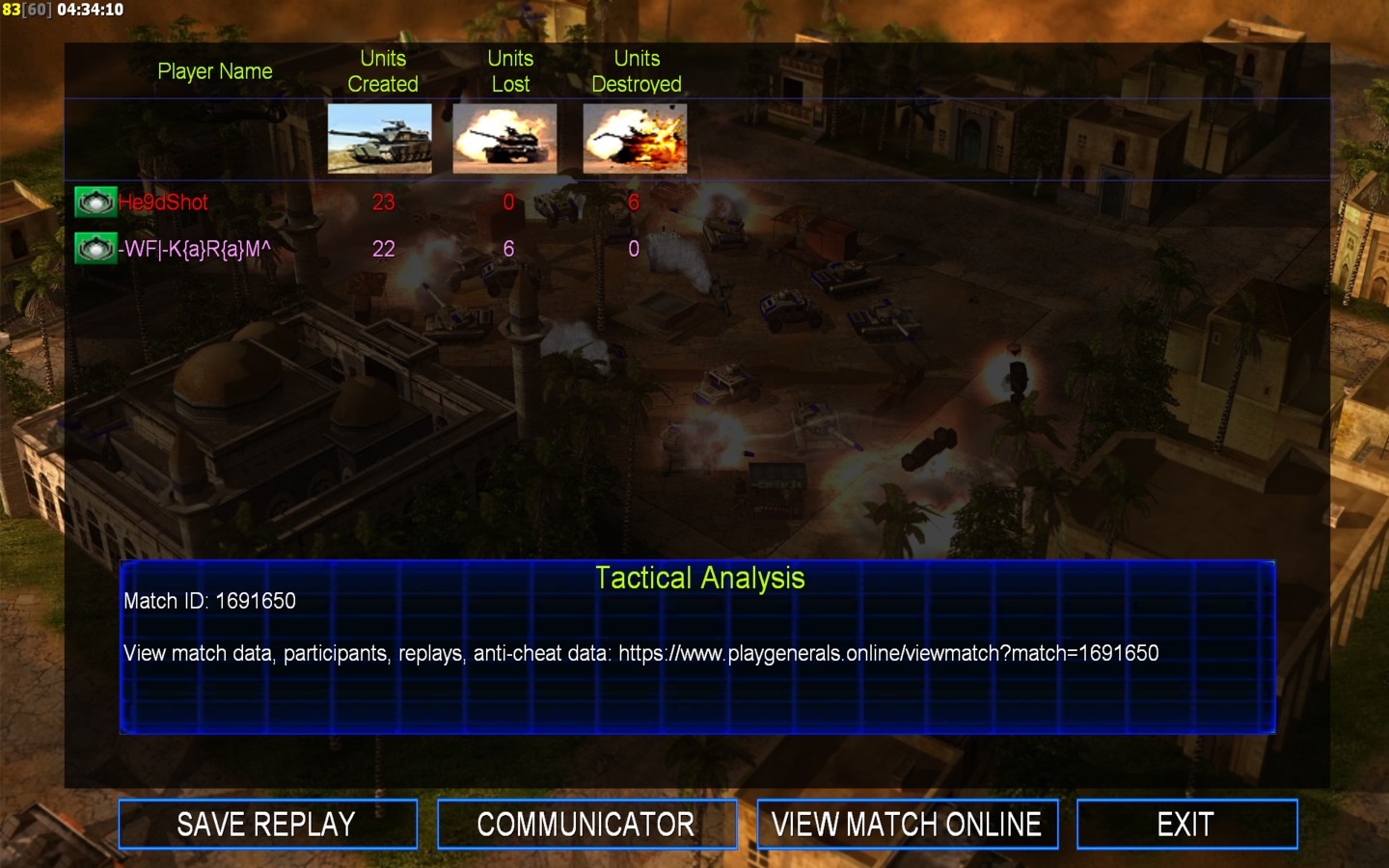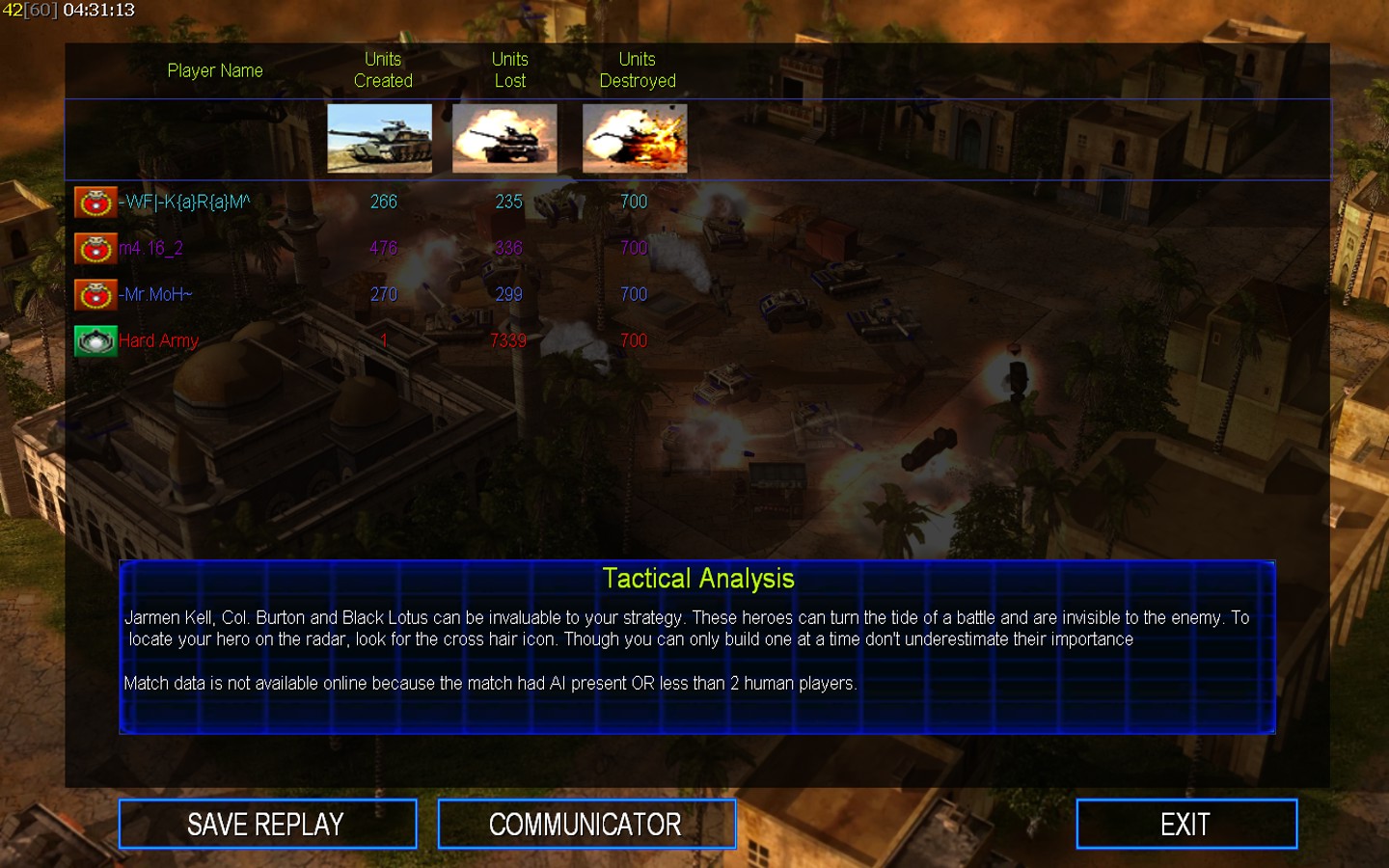 | Name | Side | Color | Team | Starting Position | Buildings Built | Buildings Lost | Buildings Destroyed | Units Built | Units Lost | Units Destroyed | Money Earned | Outcome |