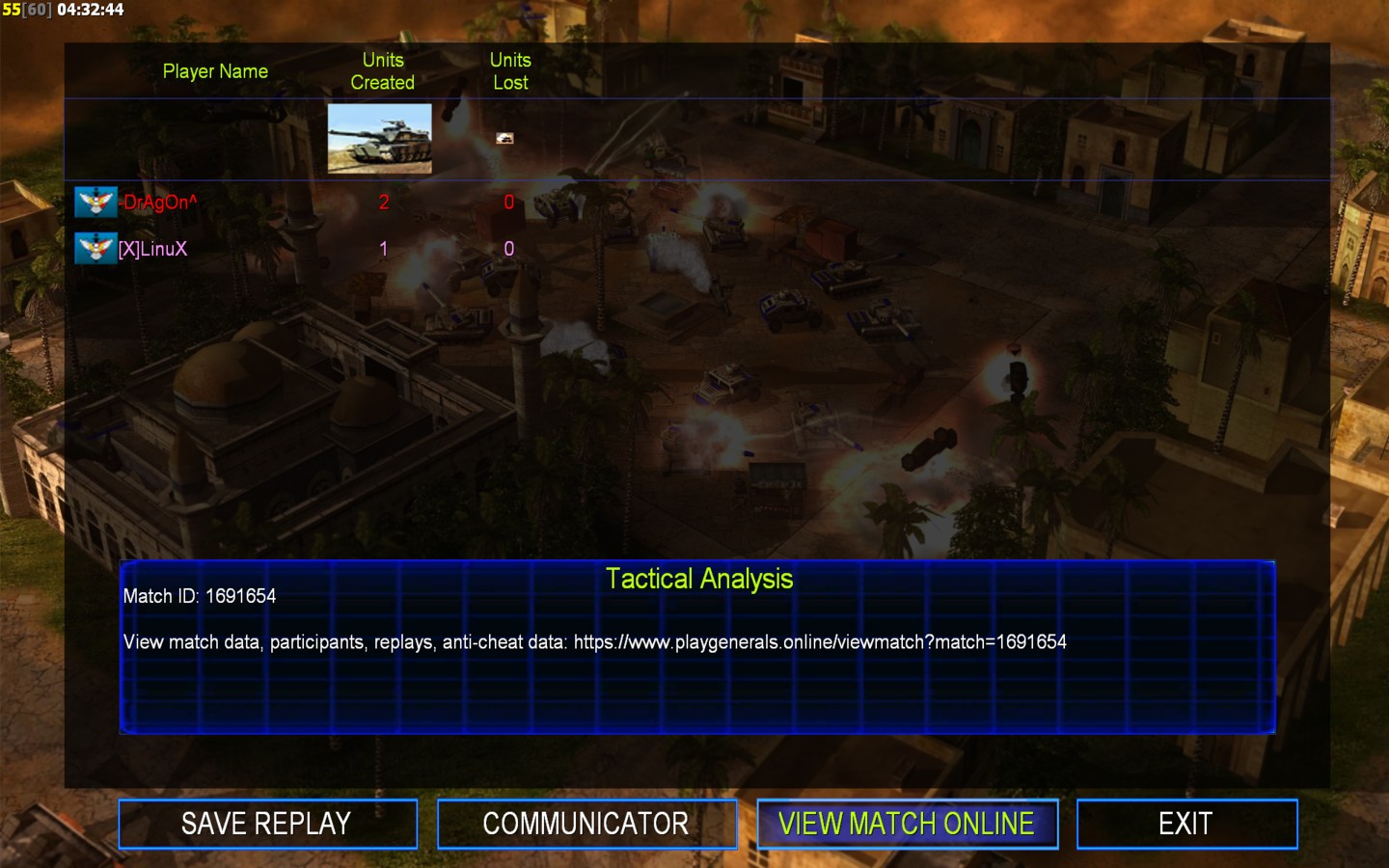 | Name | Side | Color | Team | Starting Position | Buildings Built | Buildings Lost | Buildings Destroyed | Units Built | Units Lost | Units Destroyed | Money Earned | Outcome |