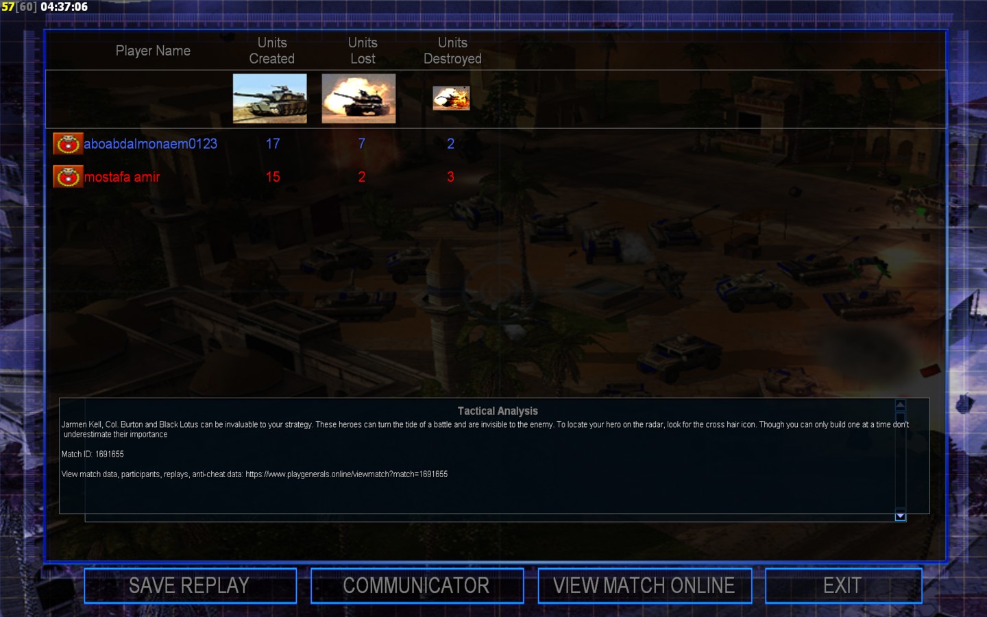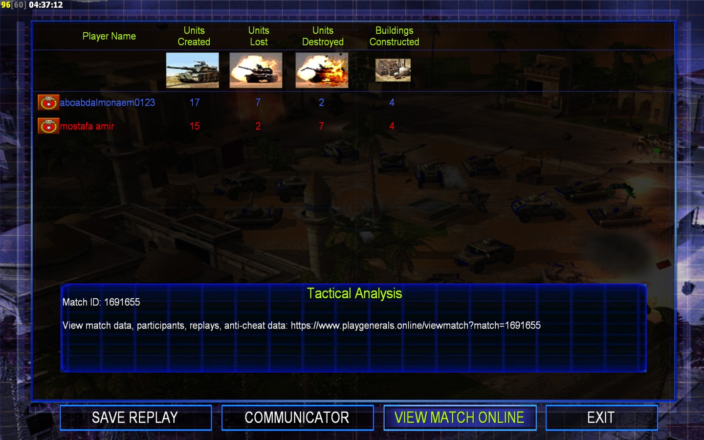 | Name | Side | Color | Team | Starting Position | Buildings Built | Buildings Lost | Buildings Destroyed | Units Built | Units Lost | Units Destroyed | Money Earned | Outcome |