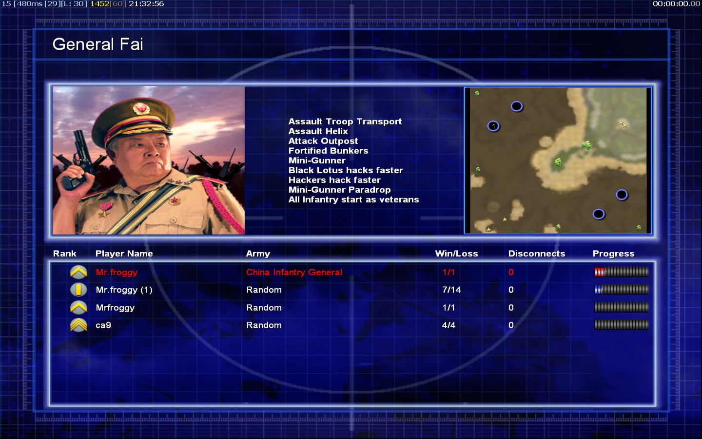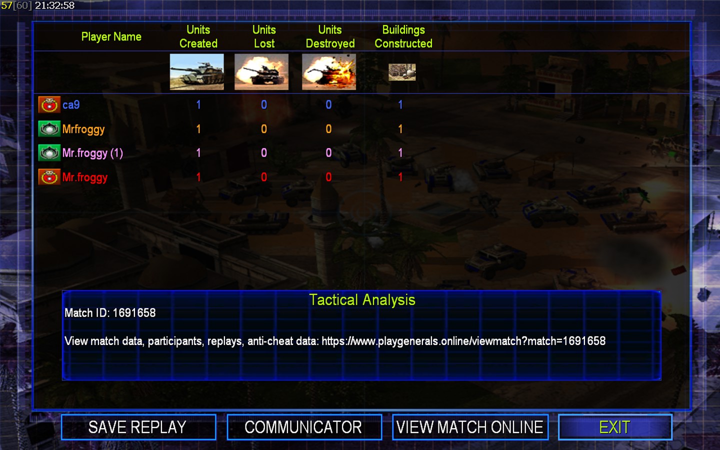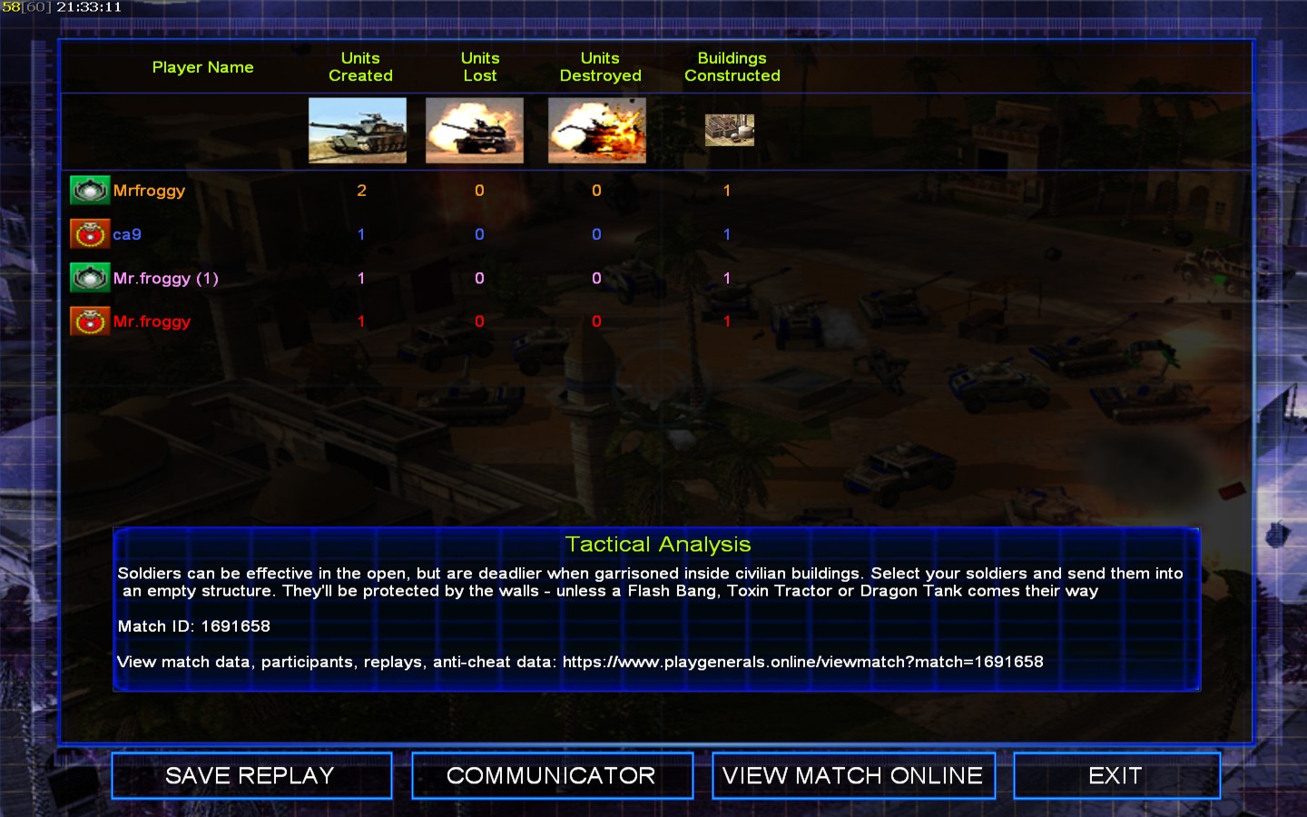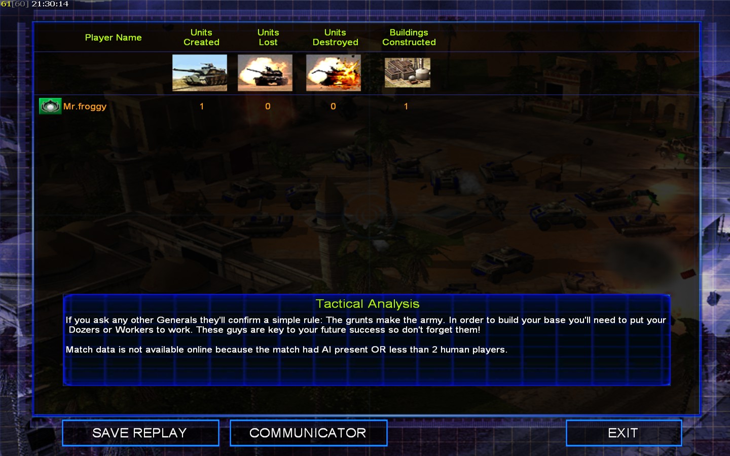 | NameMr.froggy (1) | Side | Color | TeamNone | Starting PositionNone | Buildings Built1 | Buildings Lost0 | Buildings Destroyed0 | Units Built1 | Units Lost0 | Units Destroyed0 | Money Earned0 | OutcomeLost |