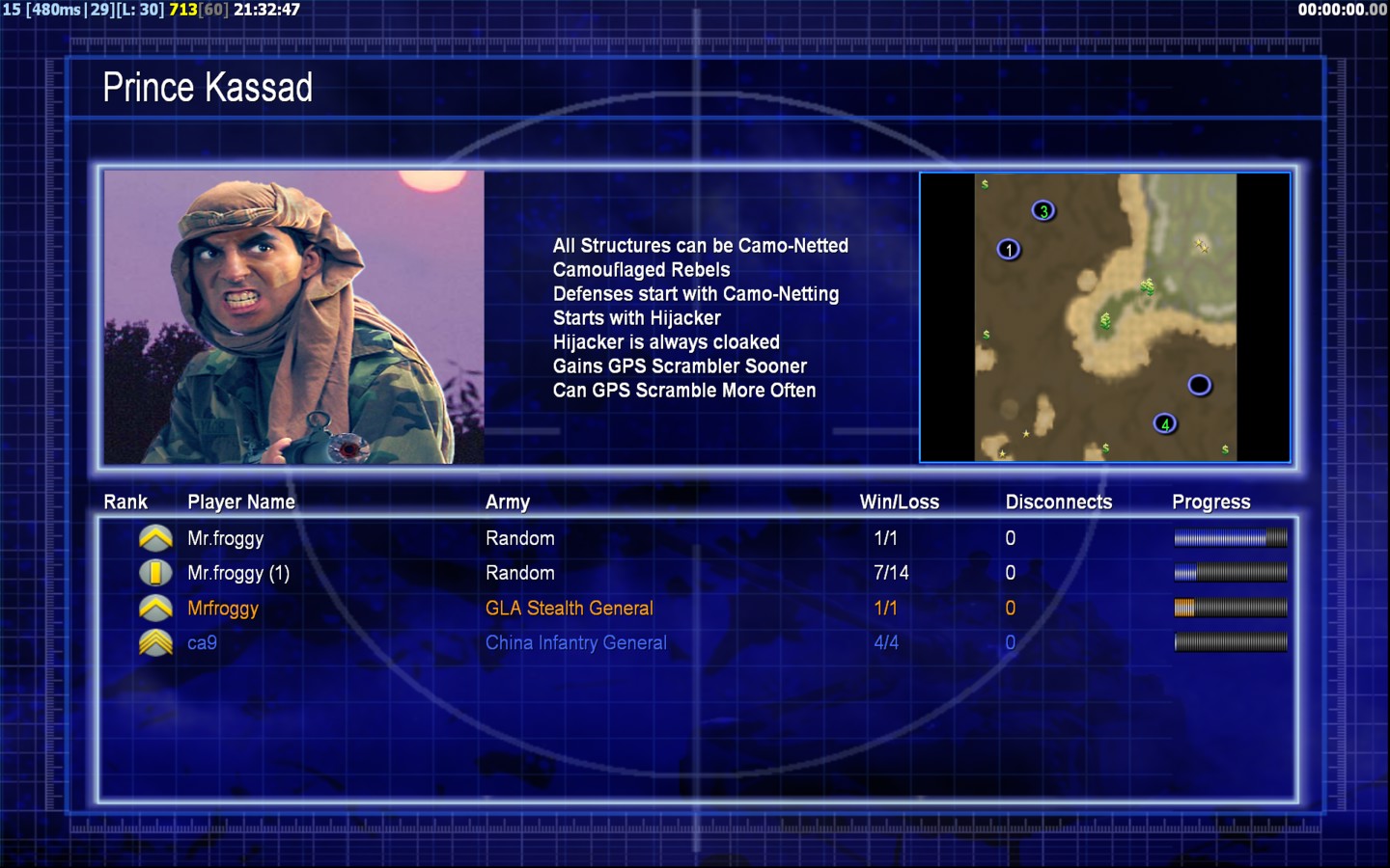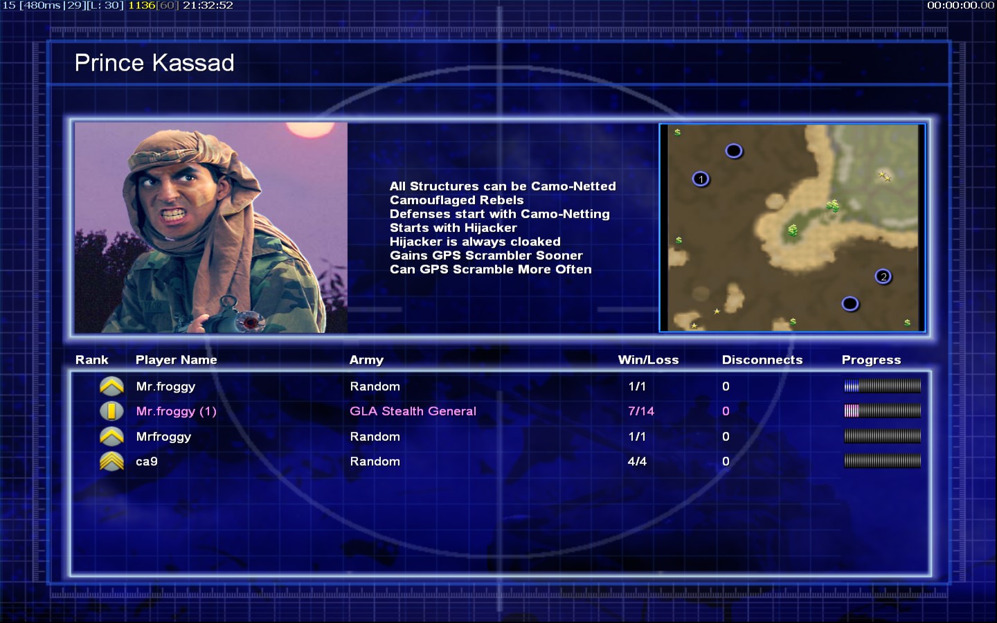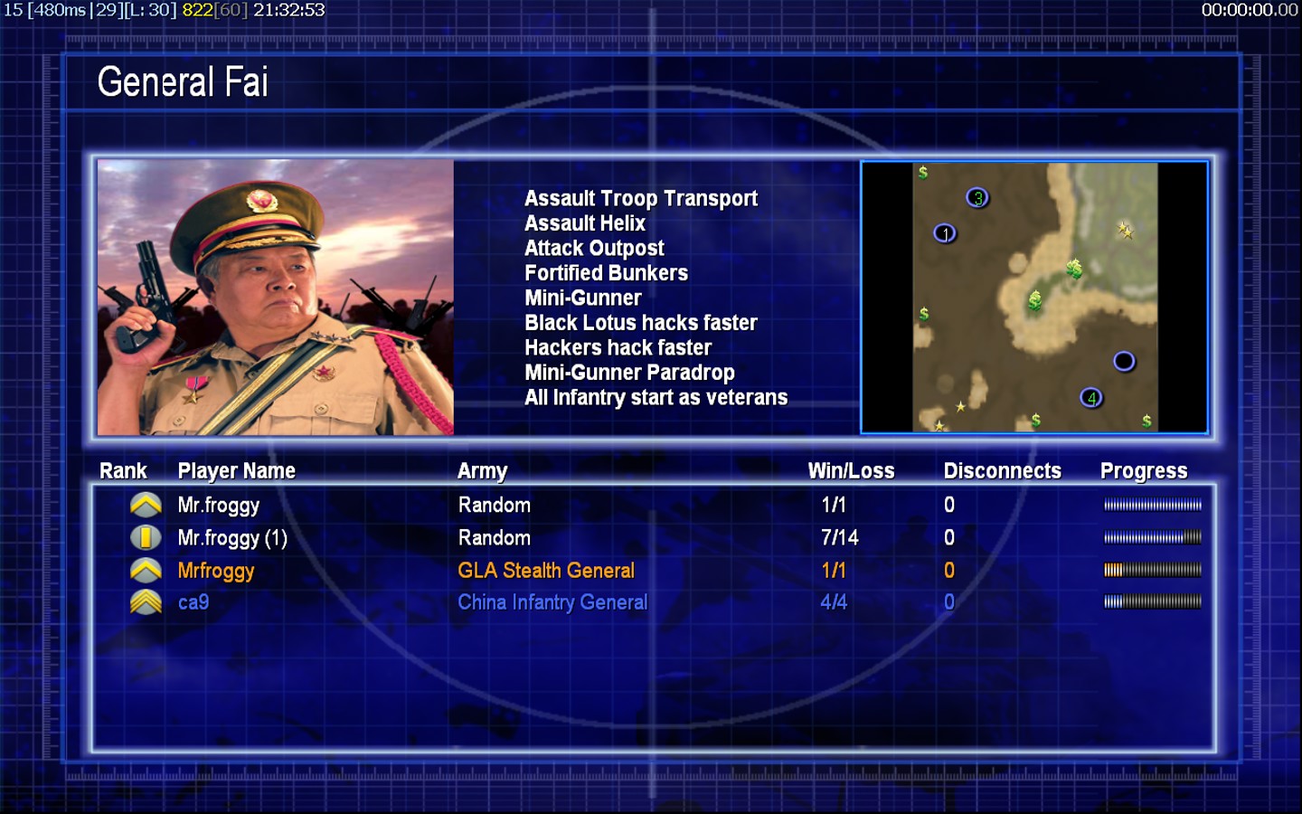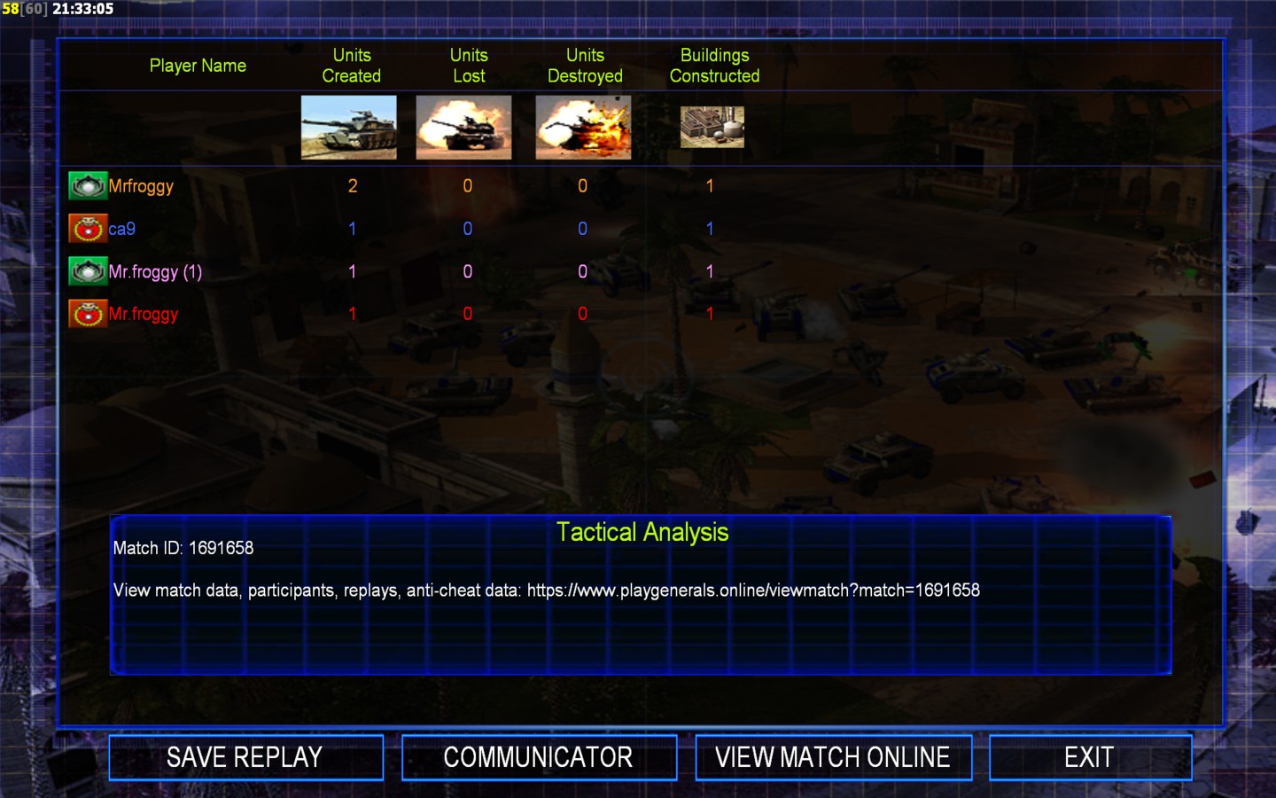 | NameMr.froggy (1) | Side | Color | TeamNone | Starting PositionNone | Buildings Built1 | Buildings Lost0 | Buildings Destroyed0 | Units Built1 | Units Lost0 | Units Destroyed0 | Money Earned0 | OutcomeLost |