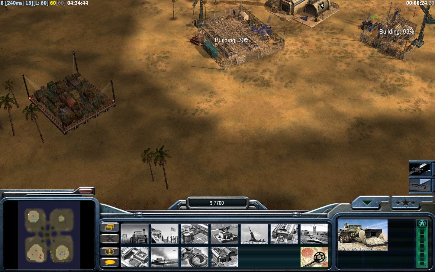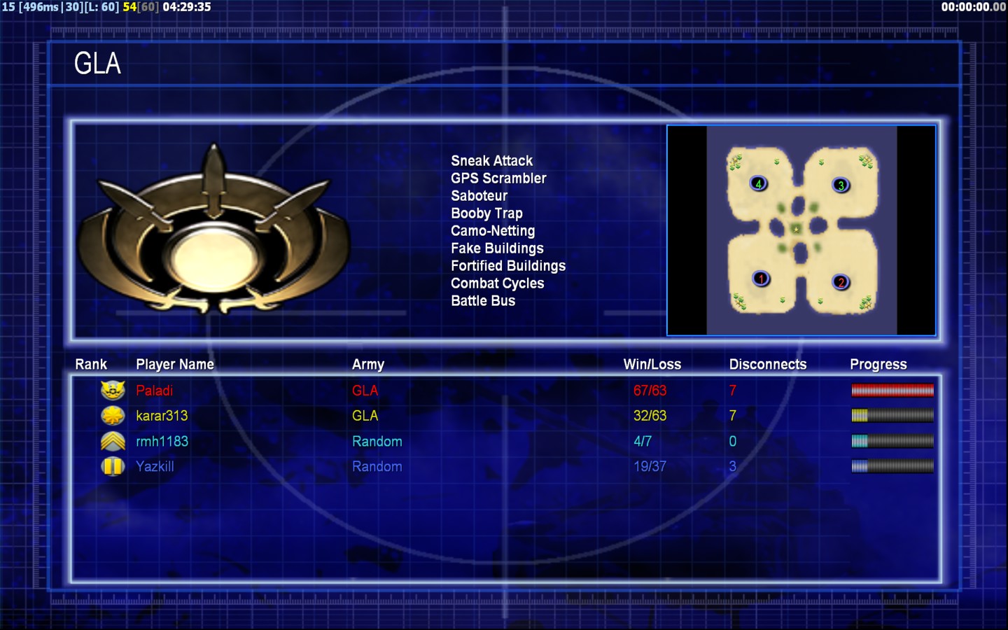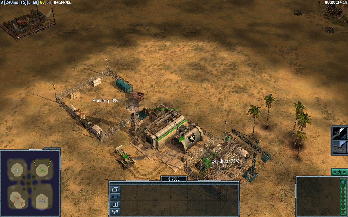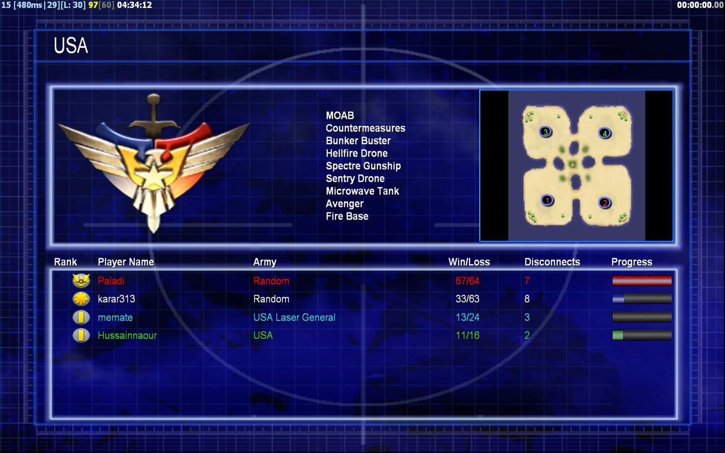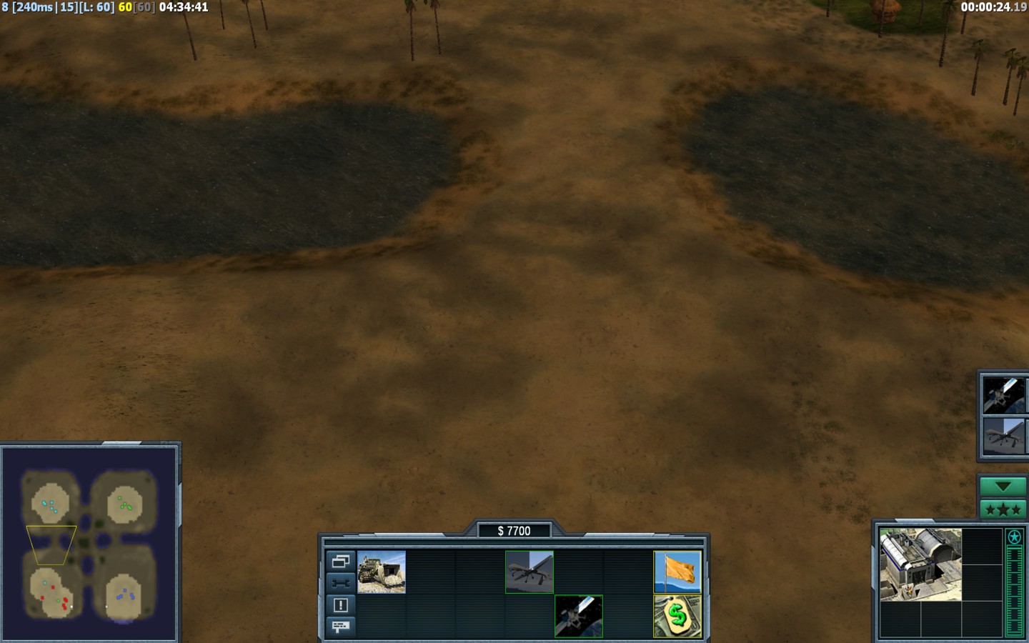 | Namememate | Side | Color | Team1 | Starting Position0 | Buildings Built6 | Buildings Lost1 | Buildings Destroyed0 | Units Built12 | Units Lost13 | Units Destroyed5 | Money Earned1800 | OutcomeLost |