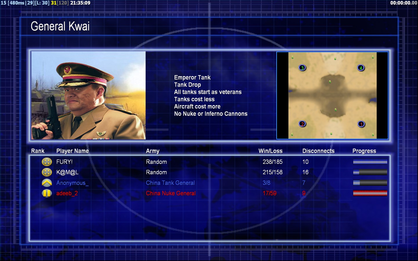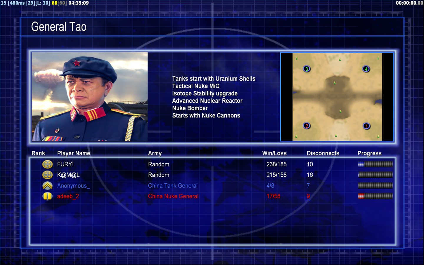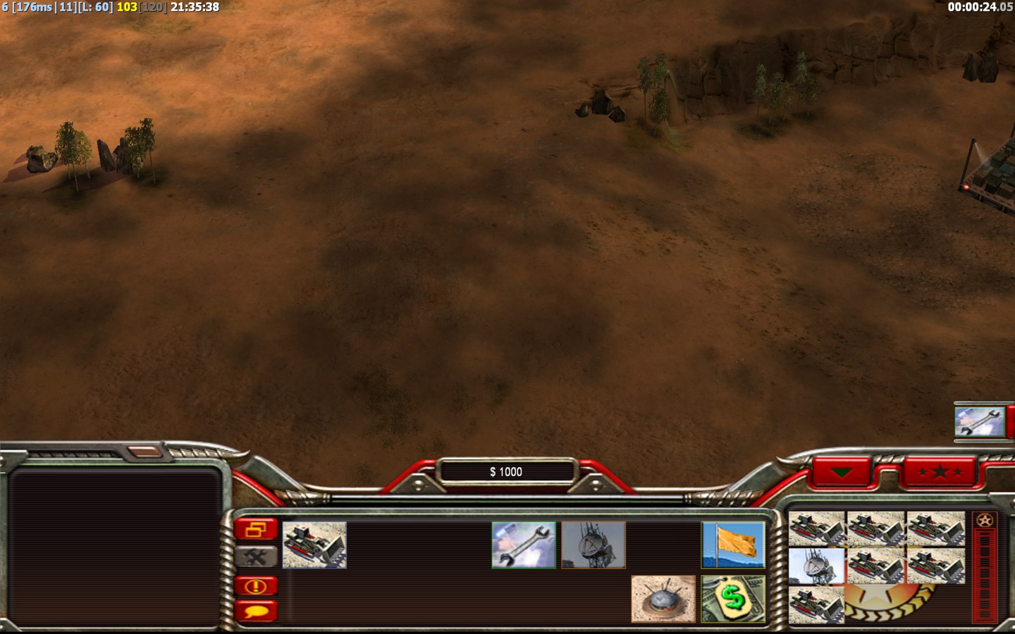 | NameFURY! | Side | Color | Team0 | Starting Position1 | Buildings Built6 | Buildings Lost0 | Buildings Destroyed0 | Units Built13 | Units Lost0 | Units Destroyed5 | Money Earned2400 | OutcomeWon |