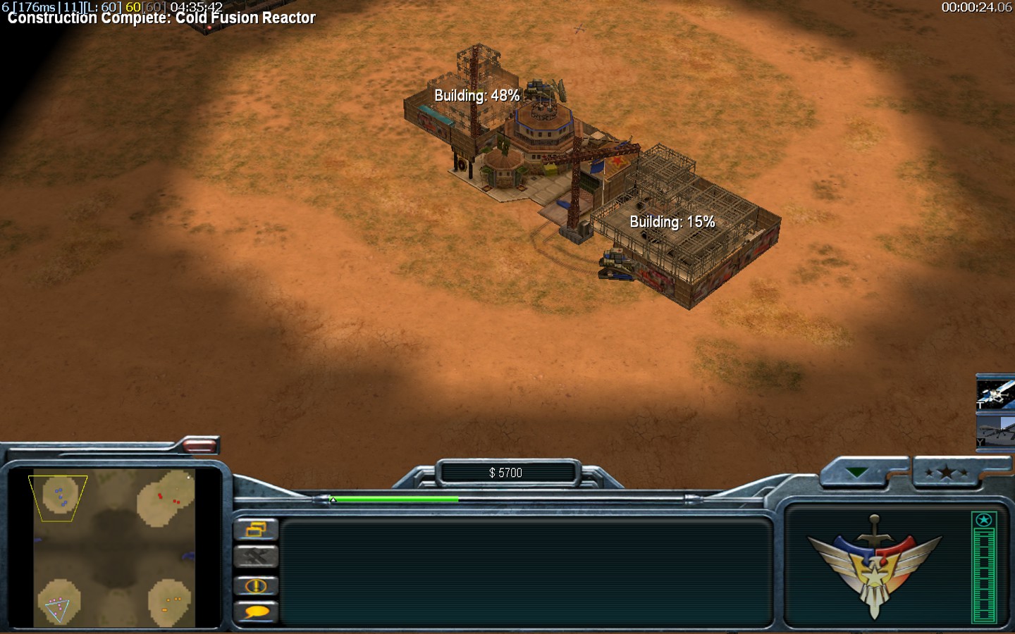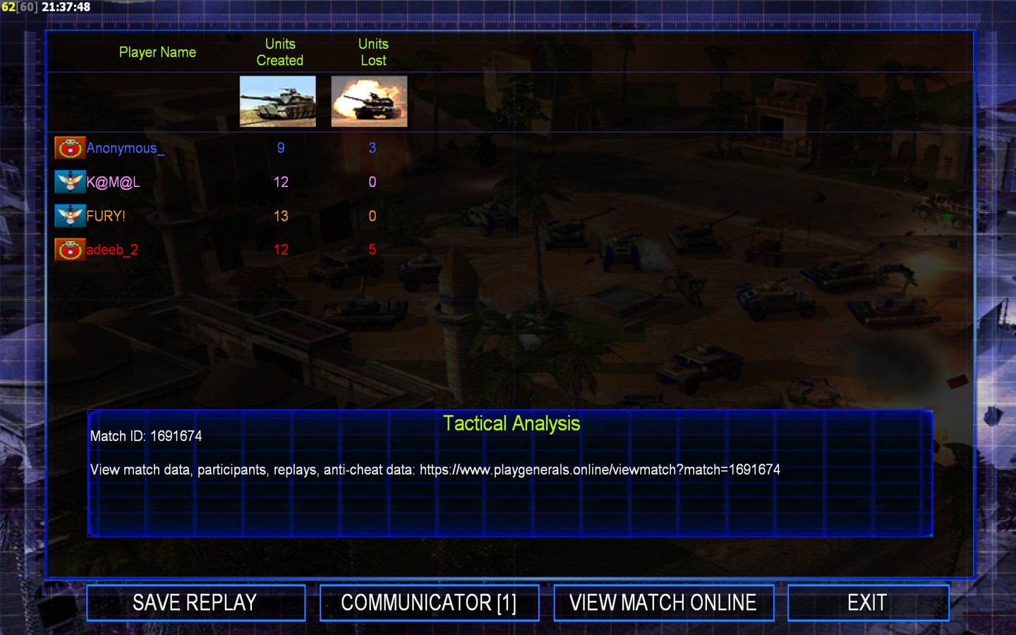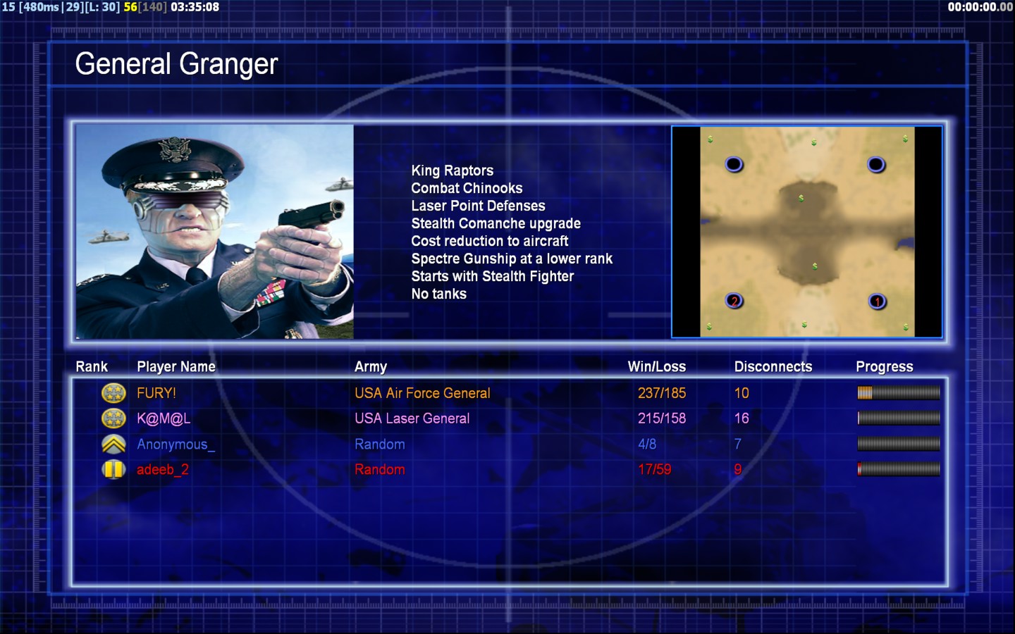 | NameFURY! | Side | Color | Team0 | Starting Position1 | Buildings Built6 | Buildings Lost0 | Buildings Destroyed0 | Units Built13 | Units Lost0 | Units Destroyed5 | Money Earned2400 | OutcomeWon |