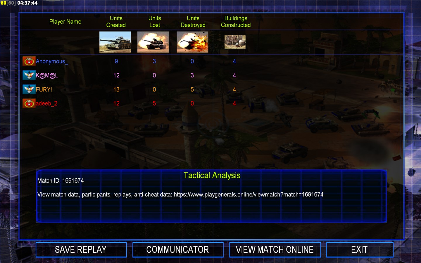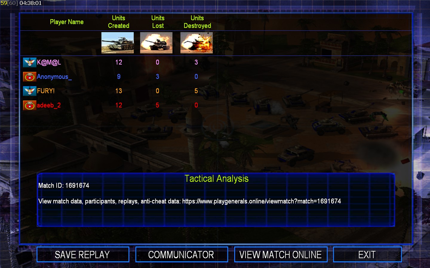 | Name | Side | Color | Team | Starting Position | Buildings Built | Buildings Lost | Buildings Destroyed | Units Built | Units Lost | Units Destroyed | Money Earned | Outcome |