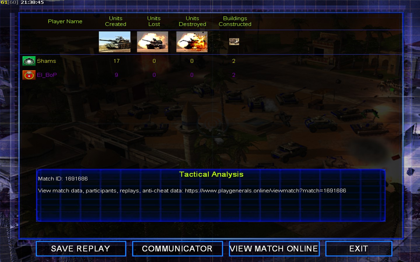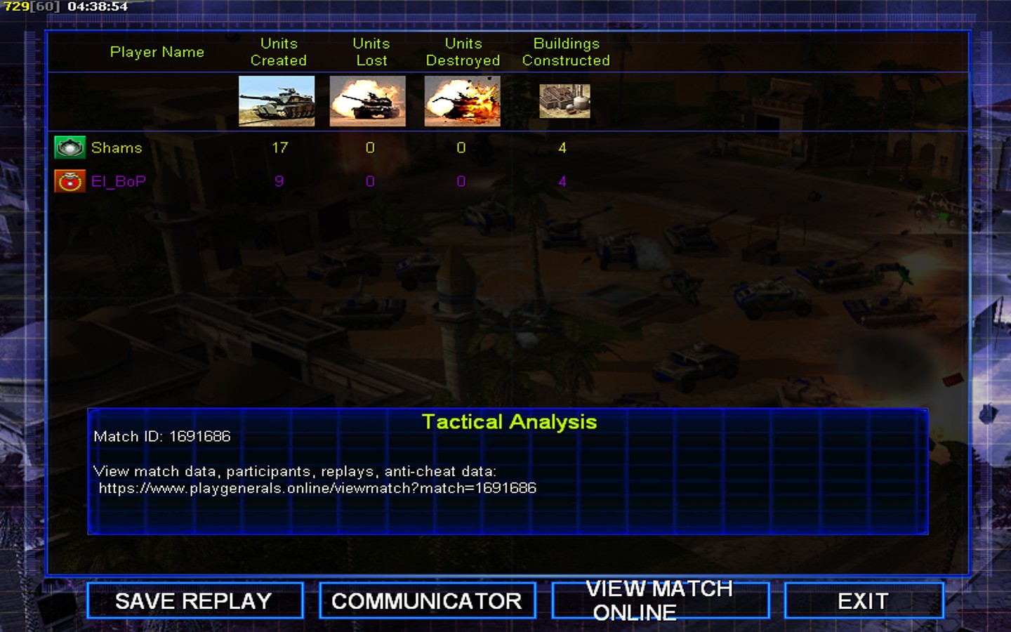 | Name | Side | Color | Team | Starting Position | Buildings Built | Buildings Lost | Buildings Destroyed | Units Built | Units Lost | Units Destroyed | Money Earned | Outcome |