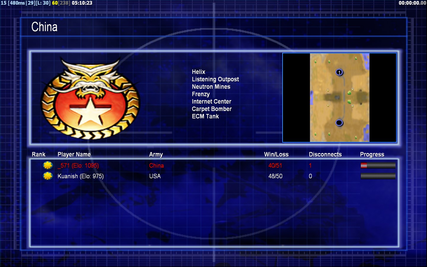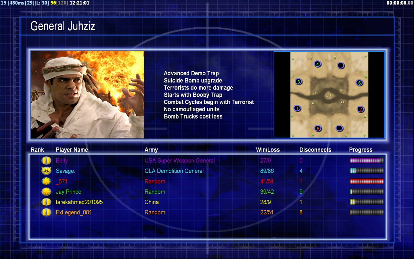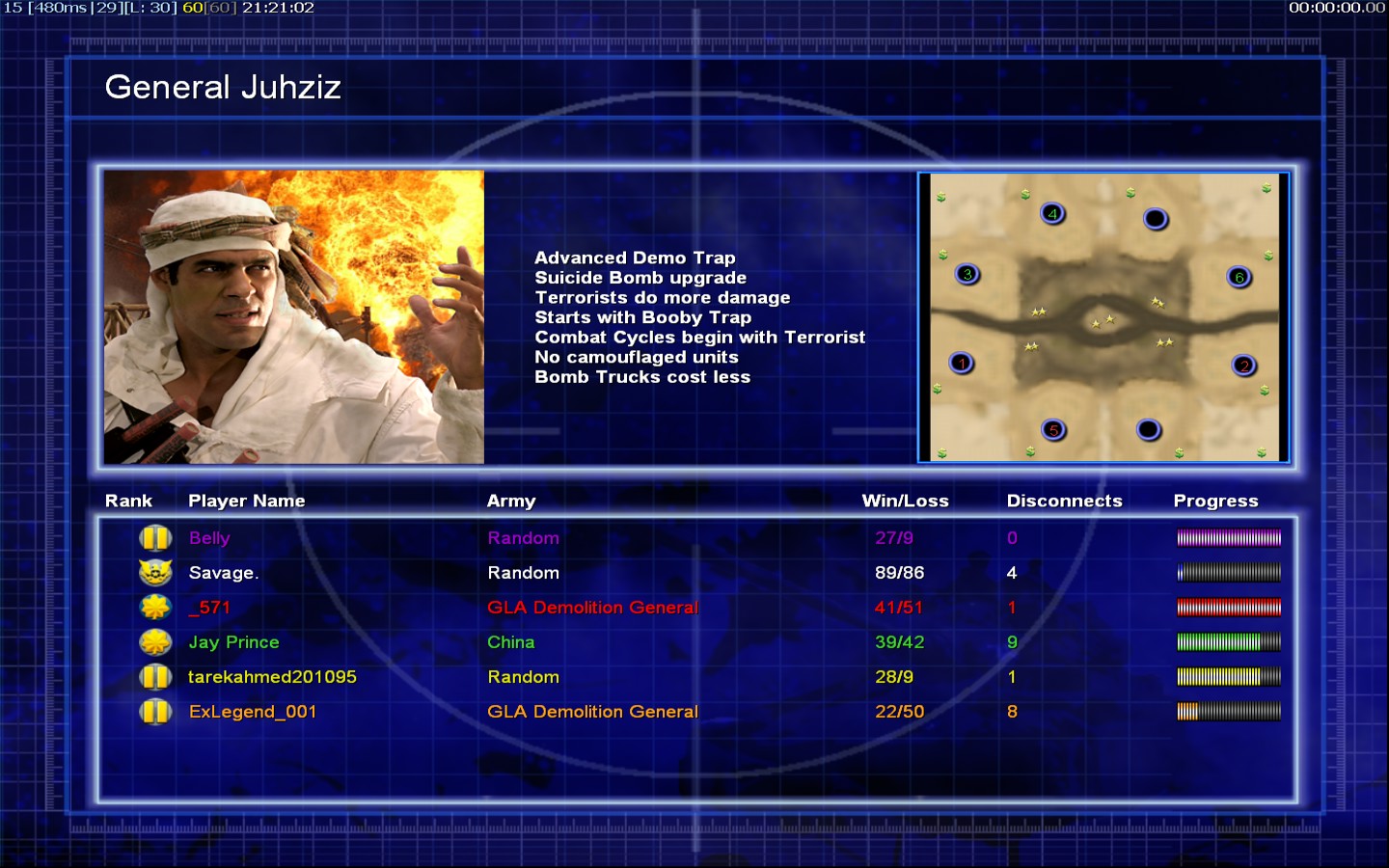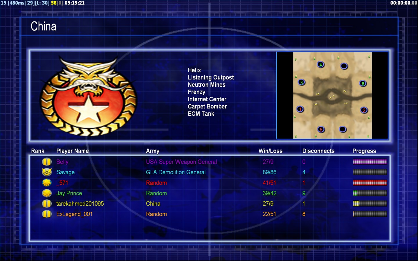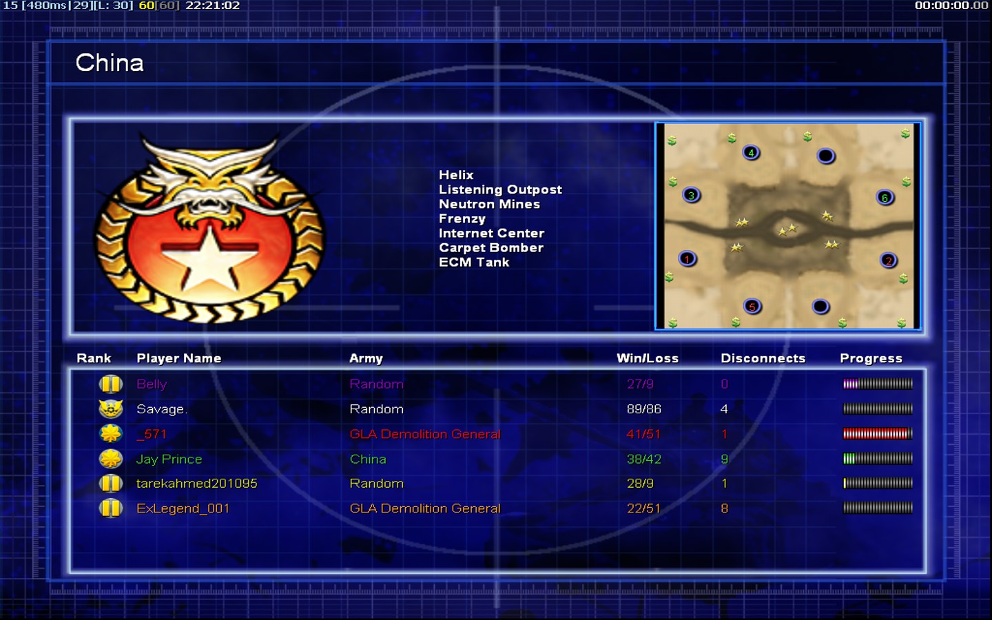 | NameBelly | Side | Color | Team0 | Starting Position7 | Buildings Built14 | Buildings Lost1 | Buildings Destroyed1 | Units Built41 | Units Lost6 | Units Destroyed16 | Money Earned17000 | OutcomeWon |
