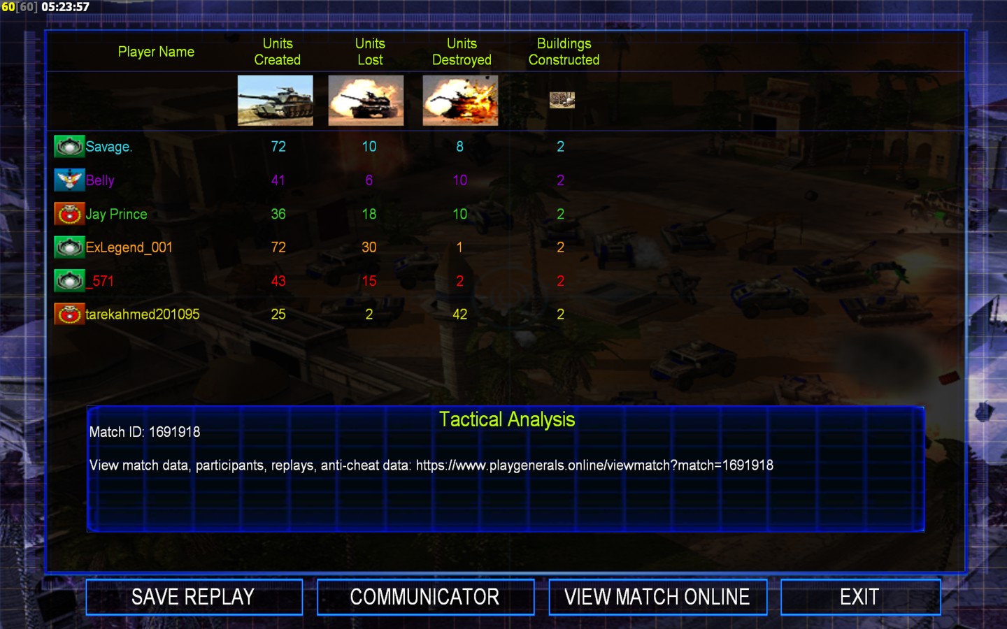 | Name | Side | Color | Team | Starting Position | Buildings Built | Buildings Lost | Buildings Destroyed | Units Built | Units Lost | Units Destroyed | Money Earned | Outcome |