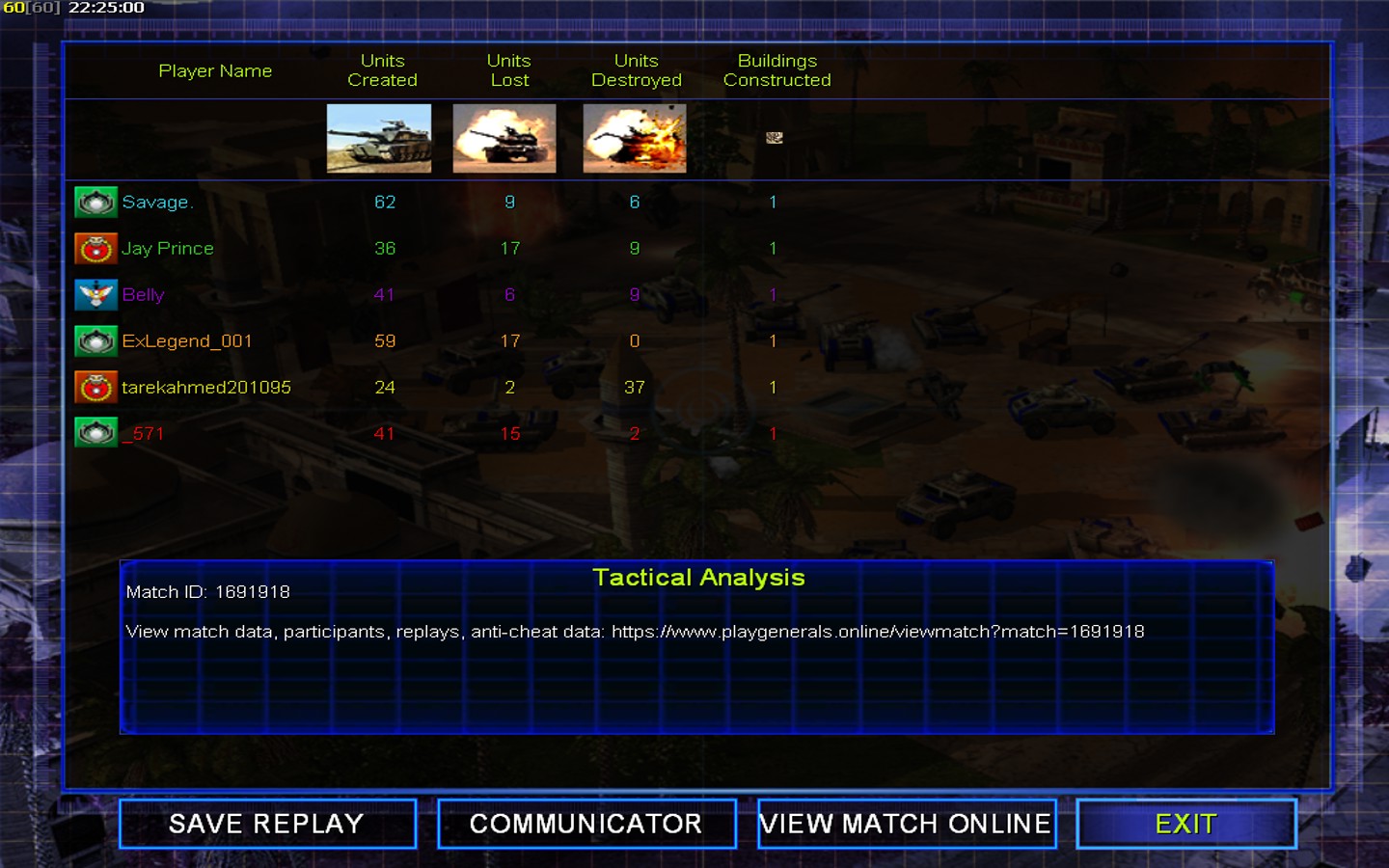 | NameSavage. | Side | Color | Team0 | Starting Position4 | Buildings Built25 | Buildings Lost0 | Buildings Destroyed0 | Units Built69 | Units Lost10 | Units Destroyed8 | Money Earned19900 | OutcomeWon |