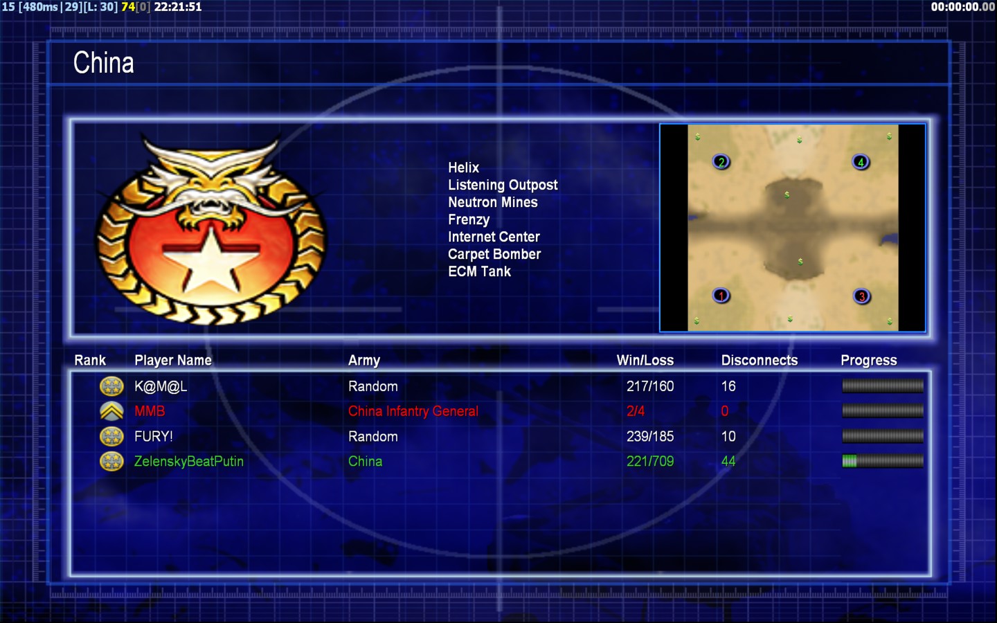 | NameZelenskyBeatPutin | Side | Color | Team1 | Starting PositionNone | Buildings Built8 | Buildings Lost3 | Buildings Destroyed0 | Units Built12 | Units Lost7 | Units Destroyed3 | Money Earned5775 | OutcomeLost |