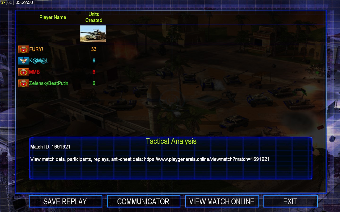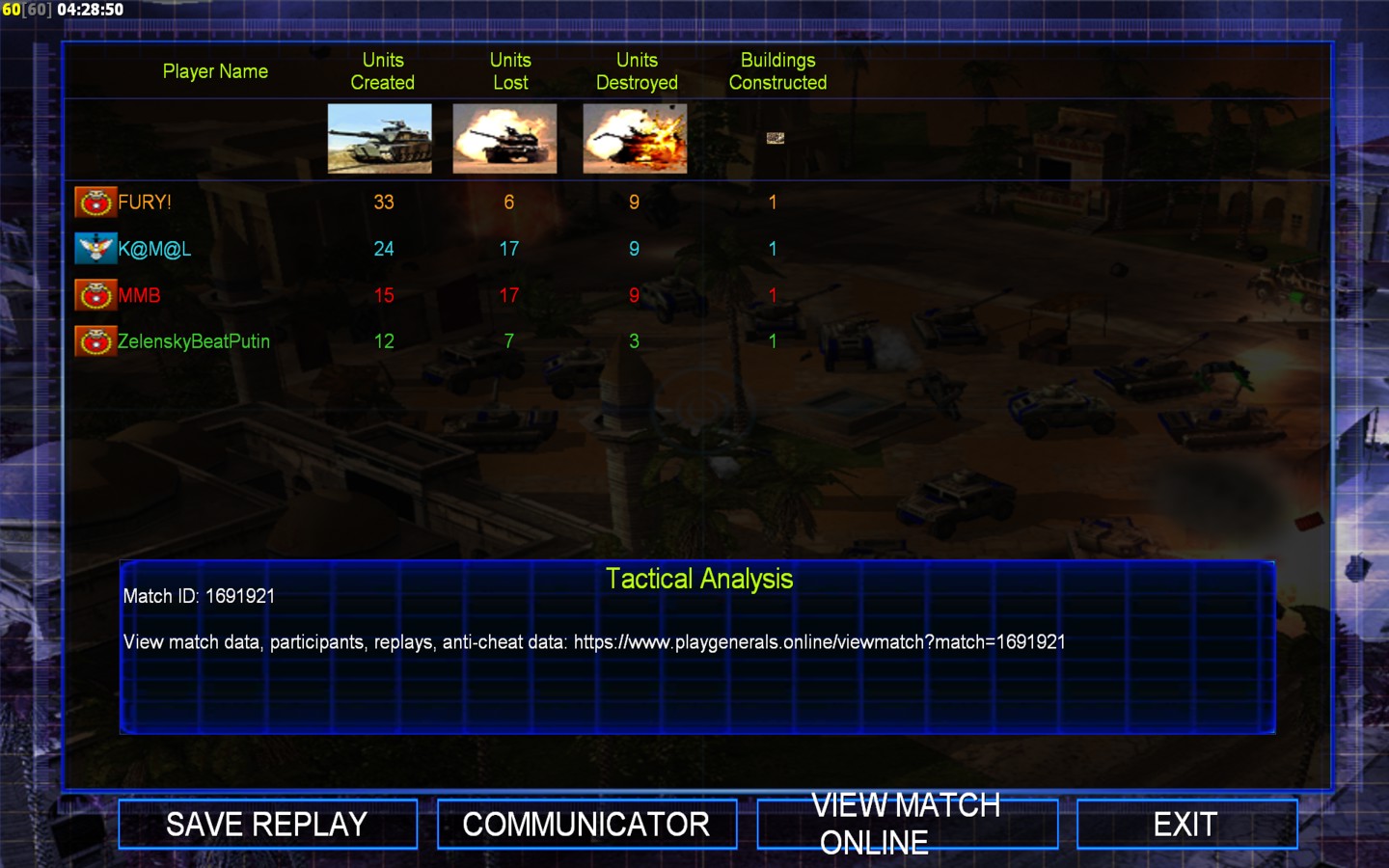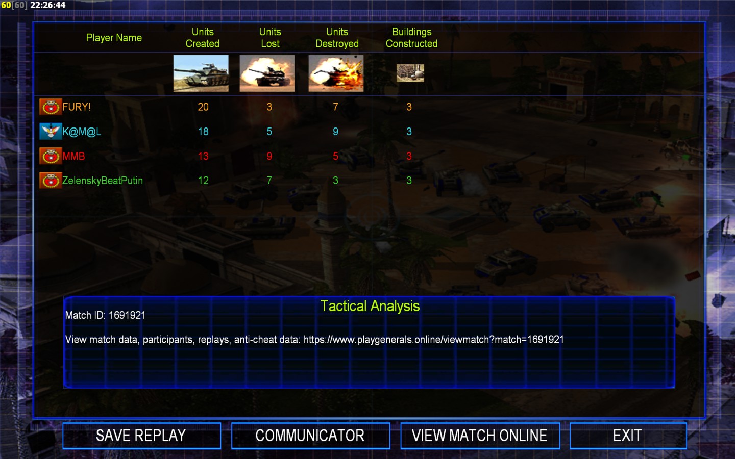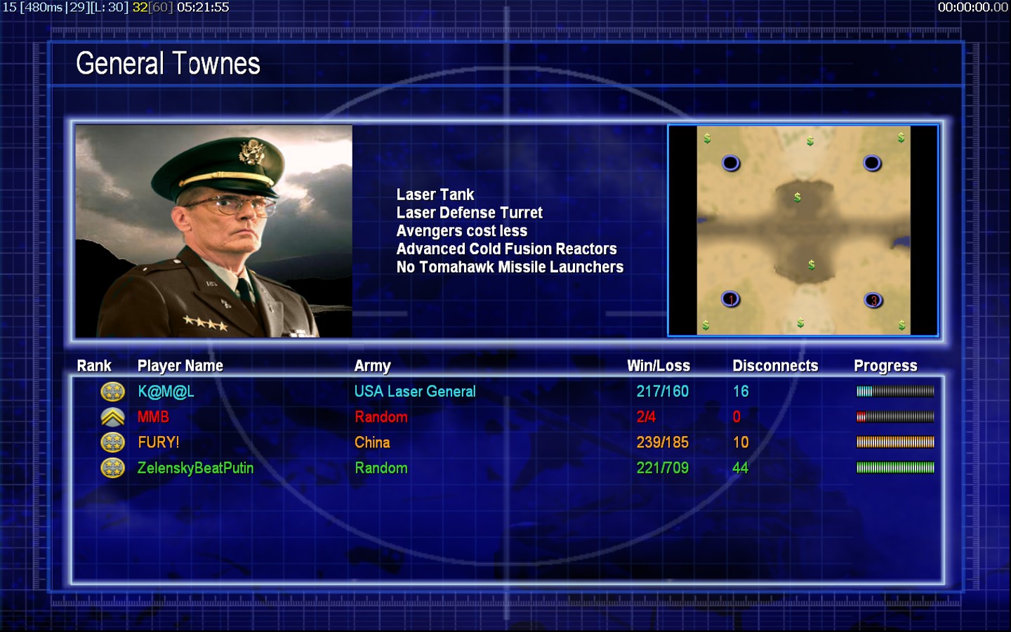 | NameMMB | Side | Color | Team1 | Starting PositionNone | Buildings Built6 | Buildings Lost5 | Buildings Destroyed3 | Units Built15 | Units Lost18 | Units Destroyed20 | Money Earned8700 | OutcomeLost |