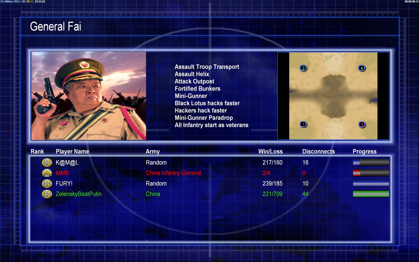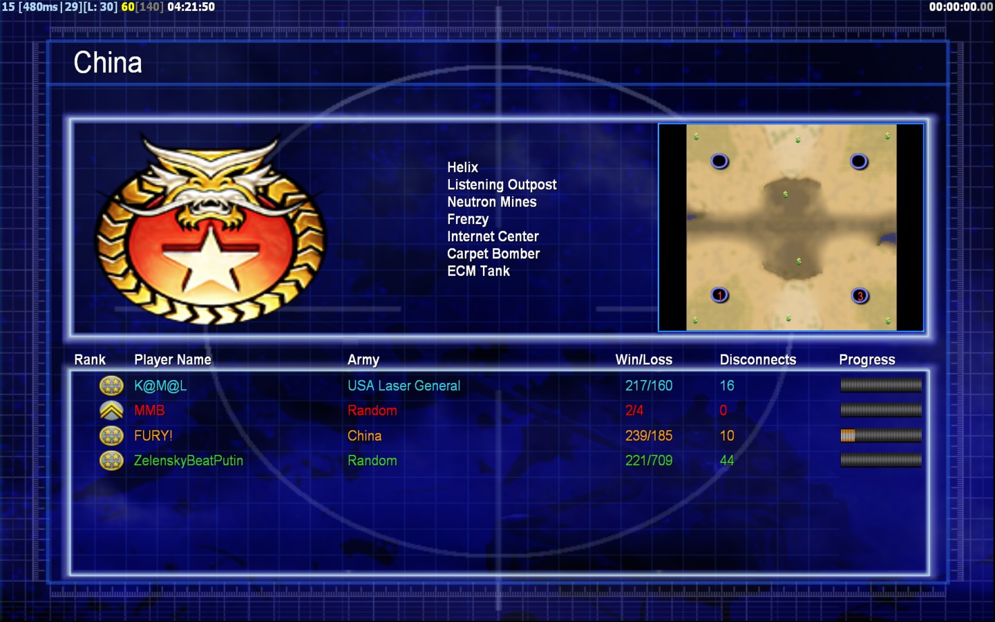 | NameFURY! | Side | Color | Team0 | Starting Position1 | Buildings Built7 | Buildings Lost0 | Buildings Destroyed8 | Units Built32 | Units Lost6 | Units Destroyed9 | Money Earned25500 | OutcomeWon |