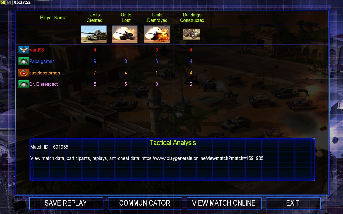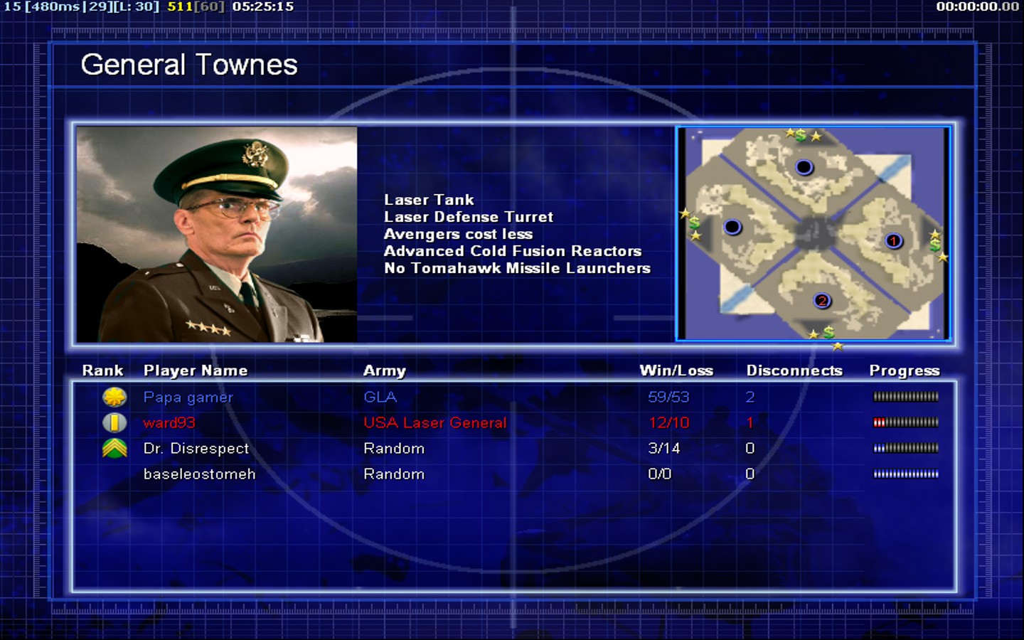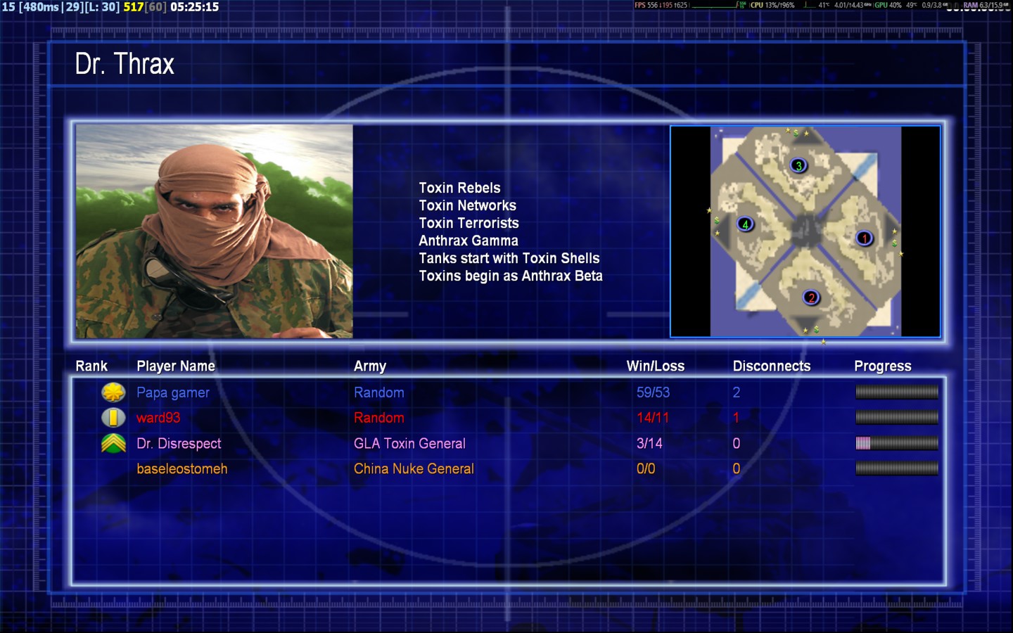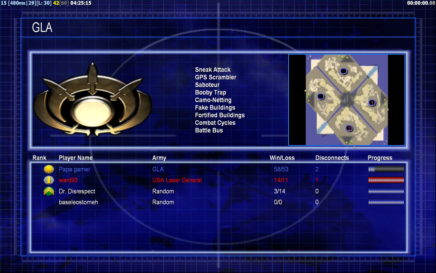 | NameDr. Disrespect | Side | Color | Team1 | Starting PositionNone | Buildings Built2 | Buildings Lost0 | Buildings Destroyed0 | Units Built5 | Units Lost5 | Units Destroyed0 | Money Earned150 | OutcomeLost |