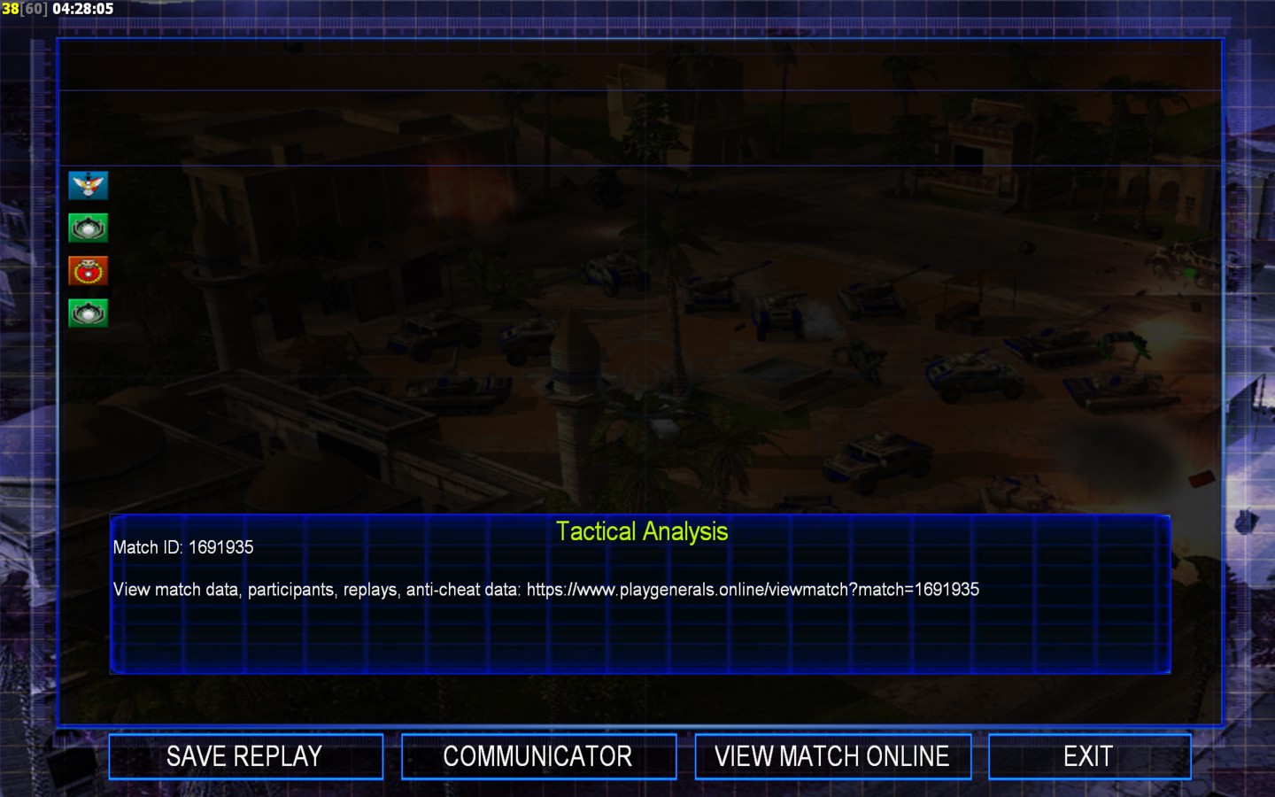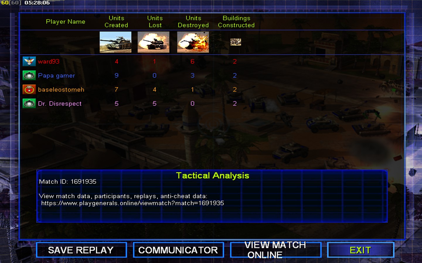 | Name | Side | Color | Team | Starting Position | Buildings Built | Buildings Lost | Buildings Destroyed | Units Built | Units Lost | Units Destroyed | Money Earned | Outcome |