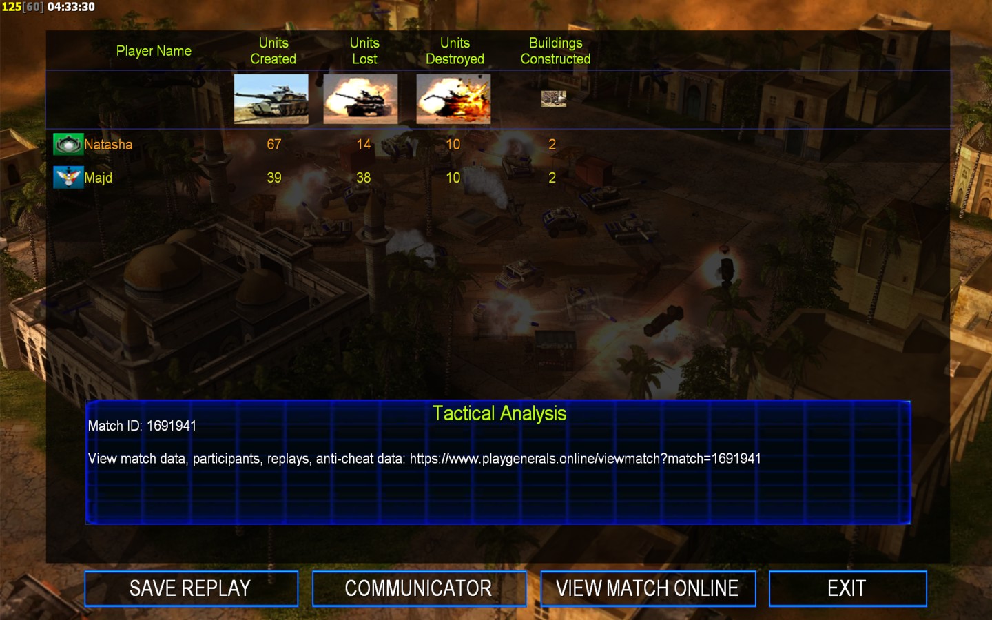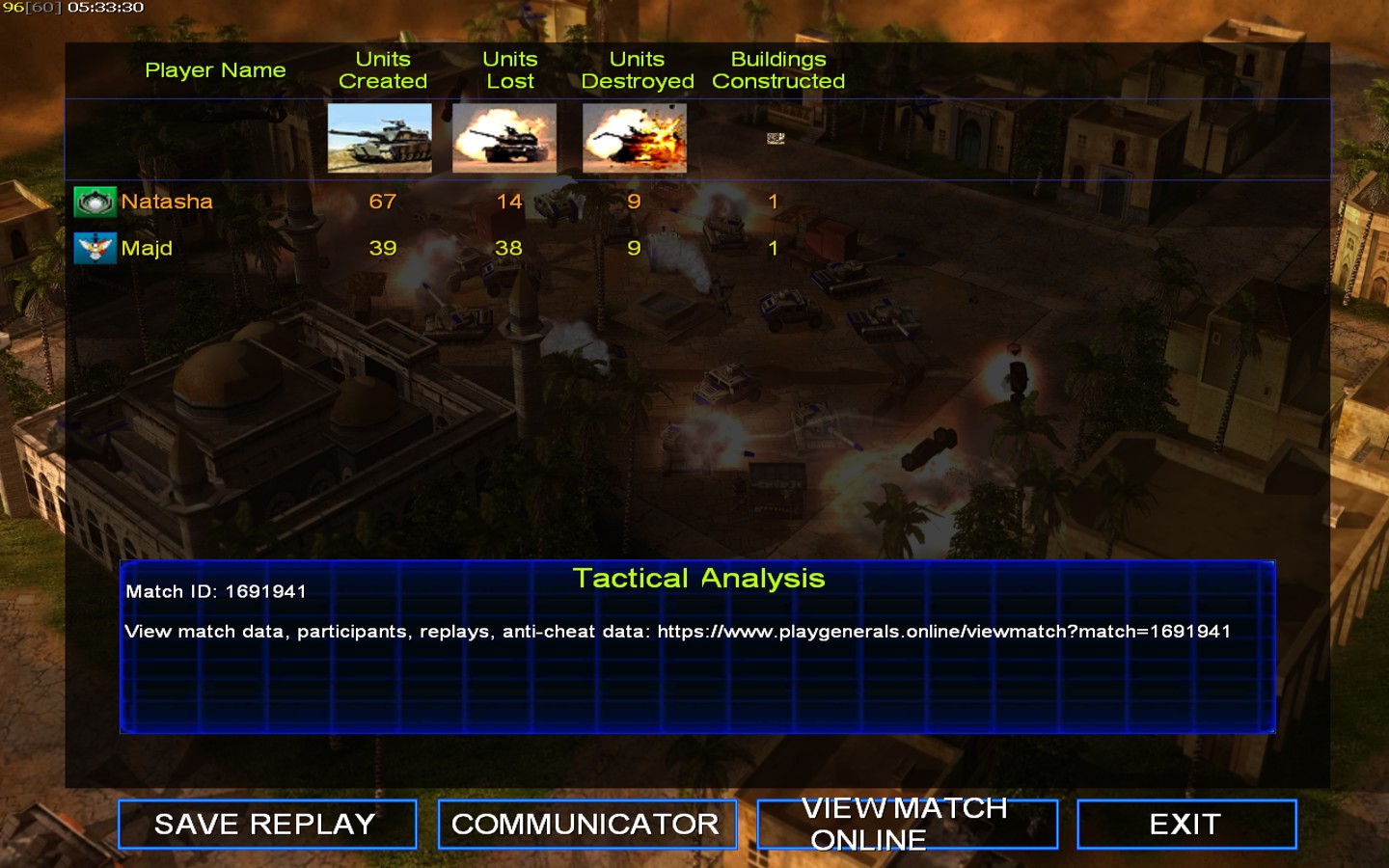 | Name | Side | Color | Team | Starting Position | Buildings Built | Buildings Lost | Buildings Destroyed | Units Built | Units Lost | Units Destroyed | Money Earned | Outcome |