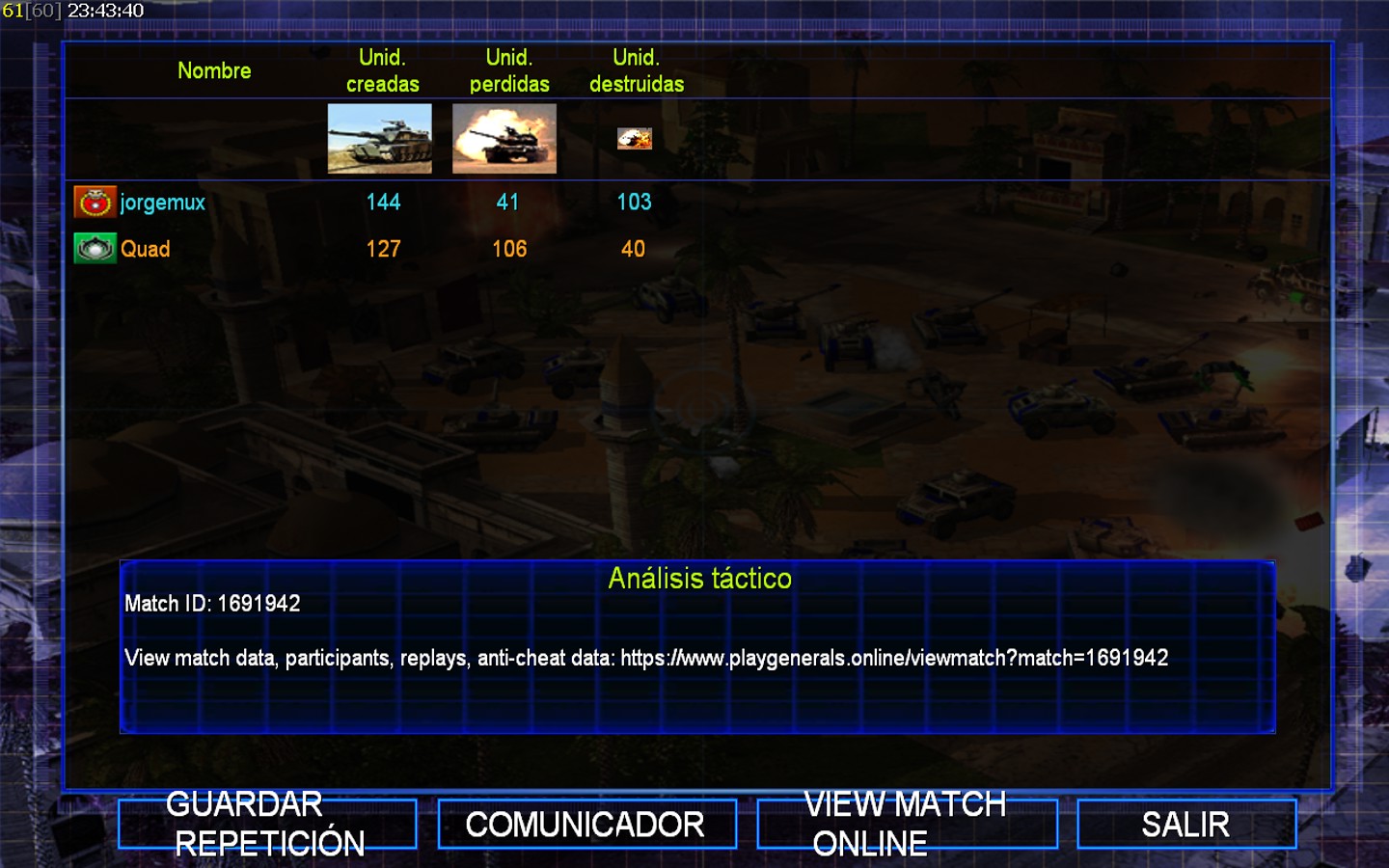 Color | TeamNone | Starting PositionNone | Buildings Built31 | Buildings Lost17 | Buildings Destroyed0 | Units Built127 | Units Lost106 | Units Destroyed40 | Money Earned100525 | OutcomeLost |