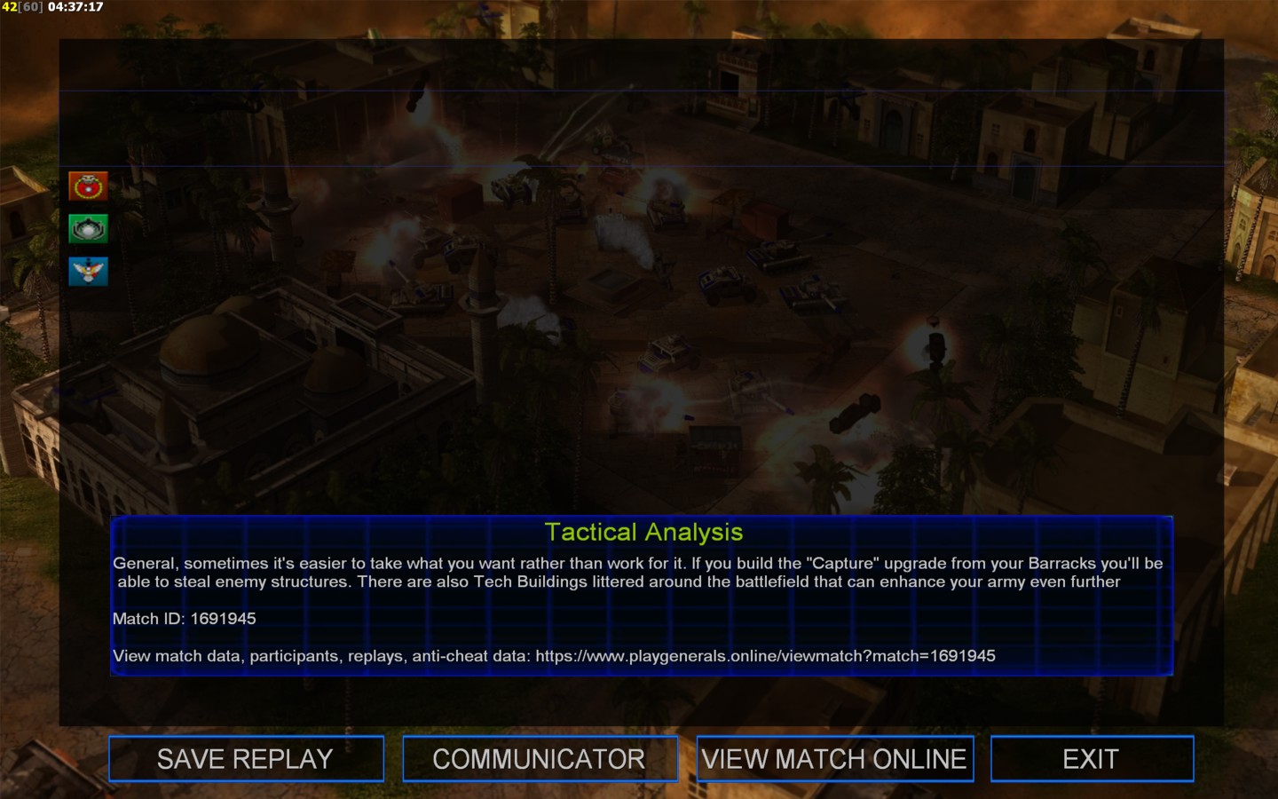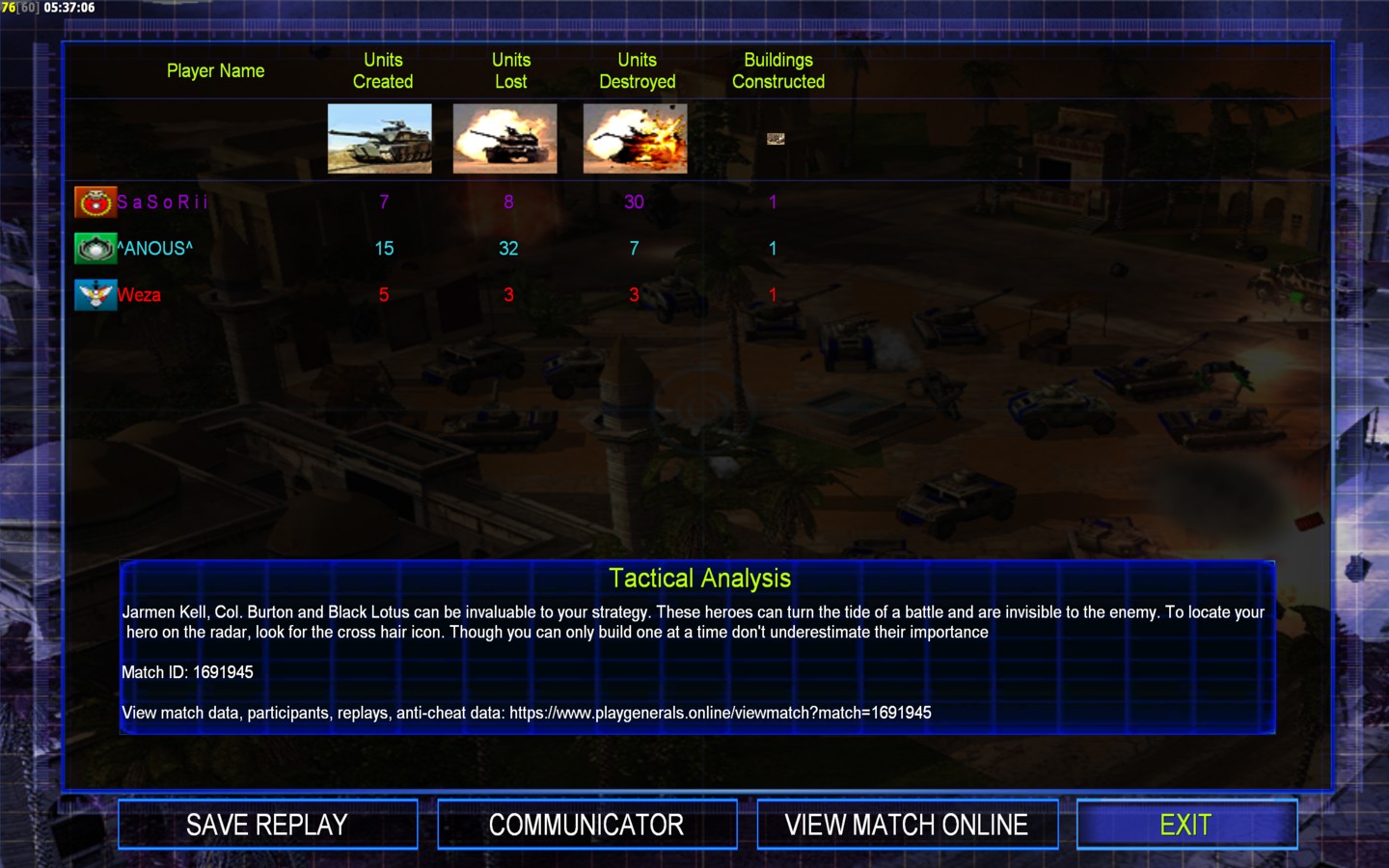 | NameS a S o R i i | Side | Color | TeamNone | Starting PositionNone | Buildings Built7 | Buildings Lost0 | Buildings Destroyed1 | Units Built7 | Units Lost8 | Units Destroyed30 | Money Earned8590 | OutcomeWon |