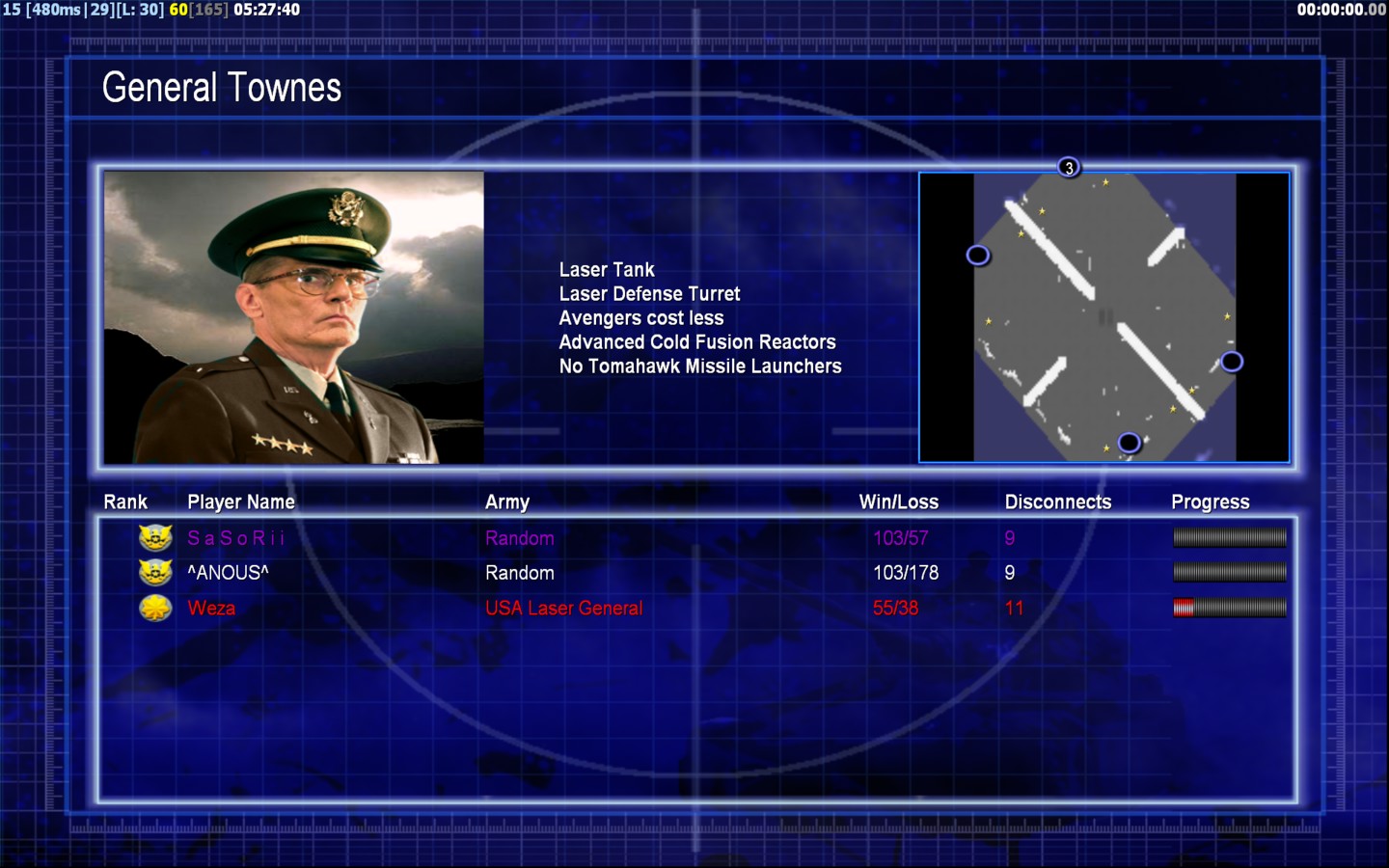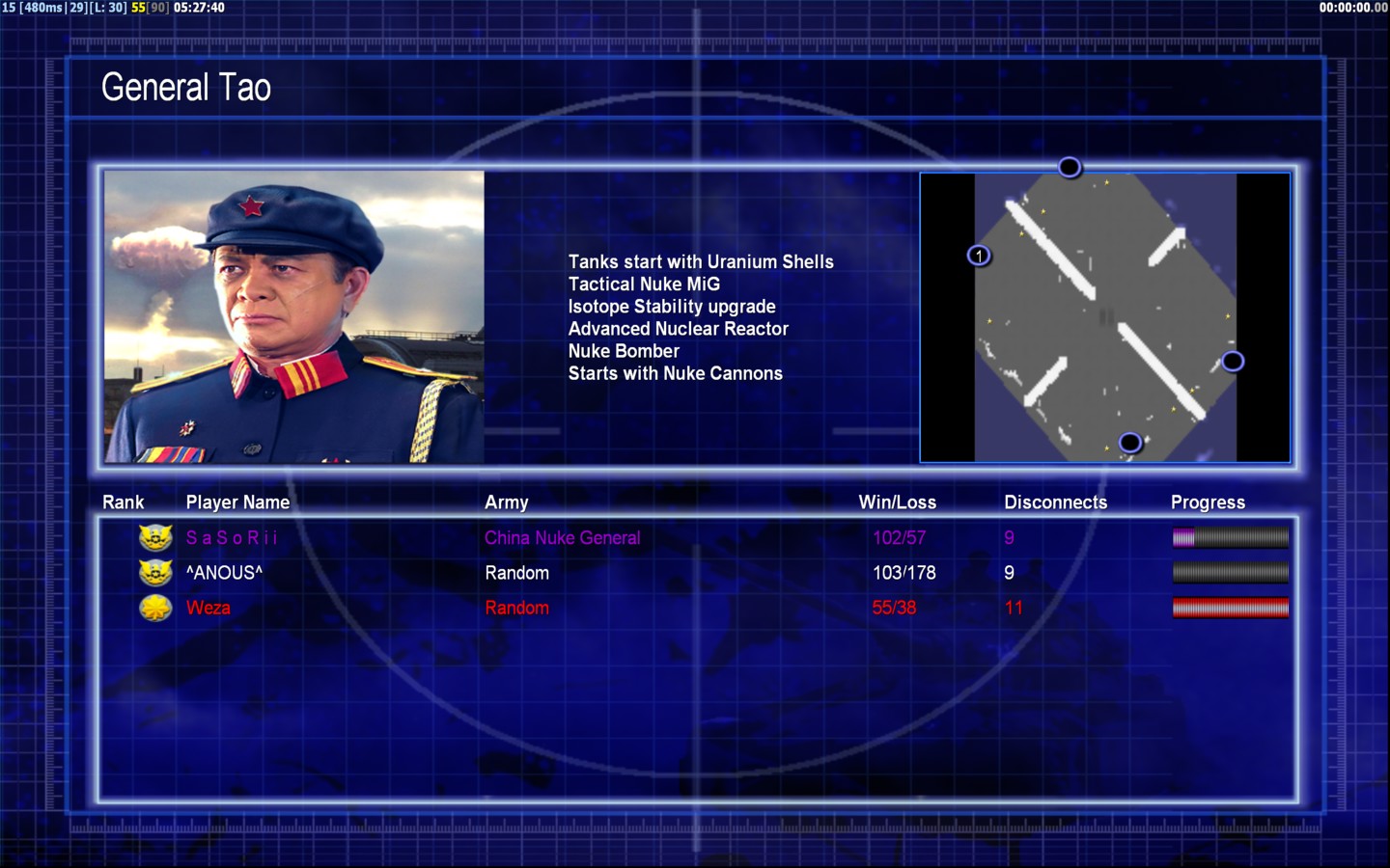 | NameWeza | Side | Color | TeamNone | Starting PositionNone | Buildings Built6 | Buildings Lost0 | Buildings Destroyed0 | Units Built5 | Units Lost3 | Units Destroyed3 | Money Earned5610 | OutcomeLost |