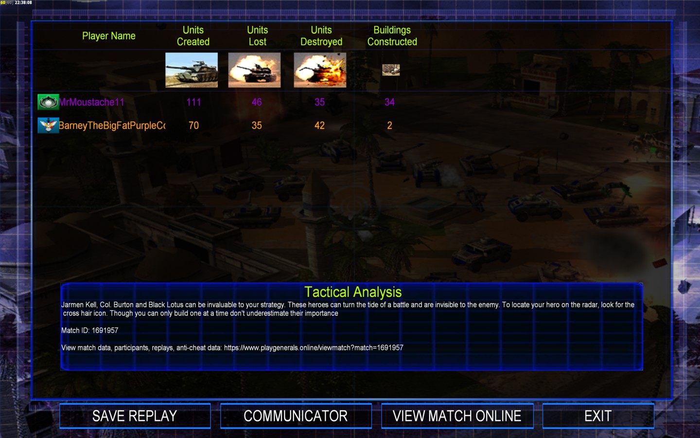 Color | TeamNone | Starting PositionNone | Buildings Built9 | Buildings Lost2 | Buildings Destroyed1 | Units Built70 | Units Lost35 | Units Destroyed42 | Money Earned62400 | OutcomeLost |