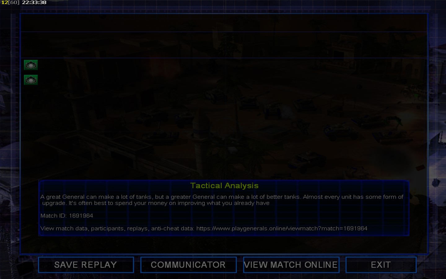 | Name | Side | Color | Team | Starting Position | Buildings Built | Buildings Lost | Buildings Destroyed | Units Built | Units Lost | Units Destroyed | Money Earned | Outcome |