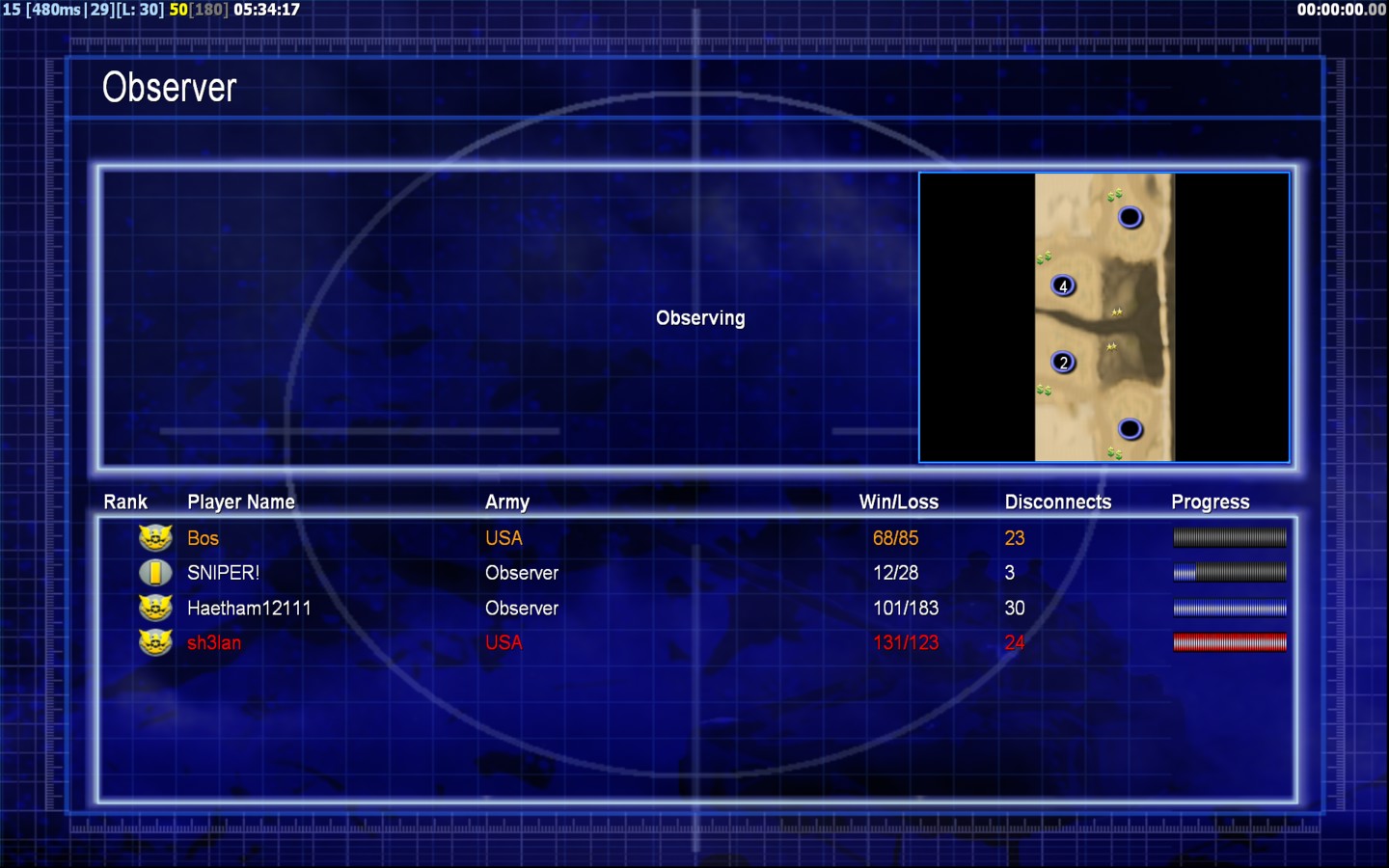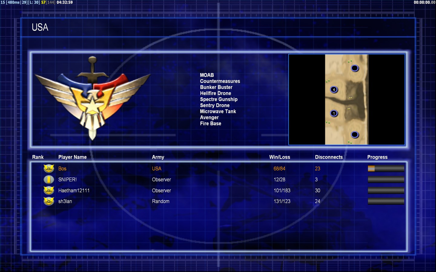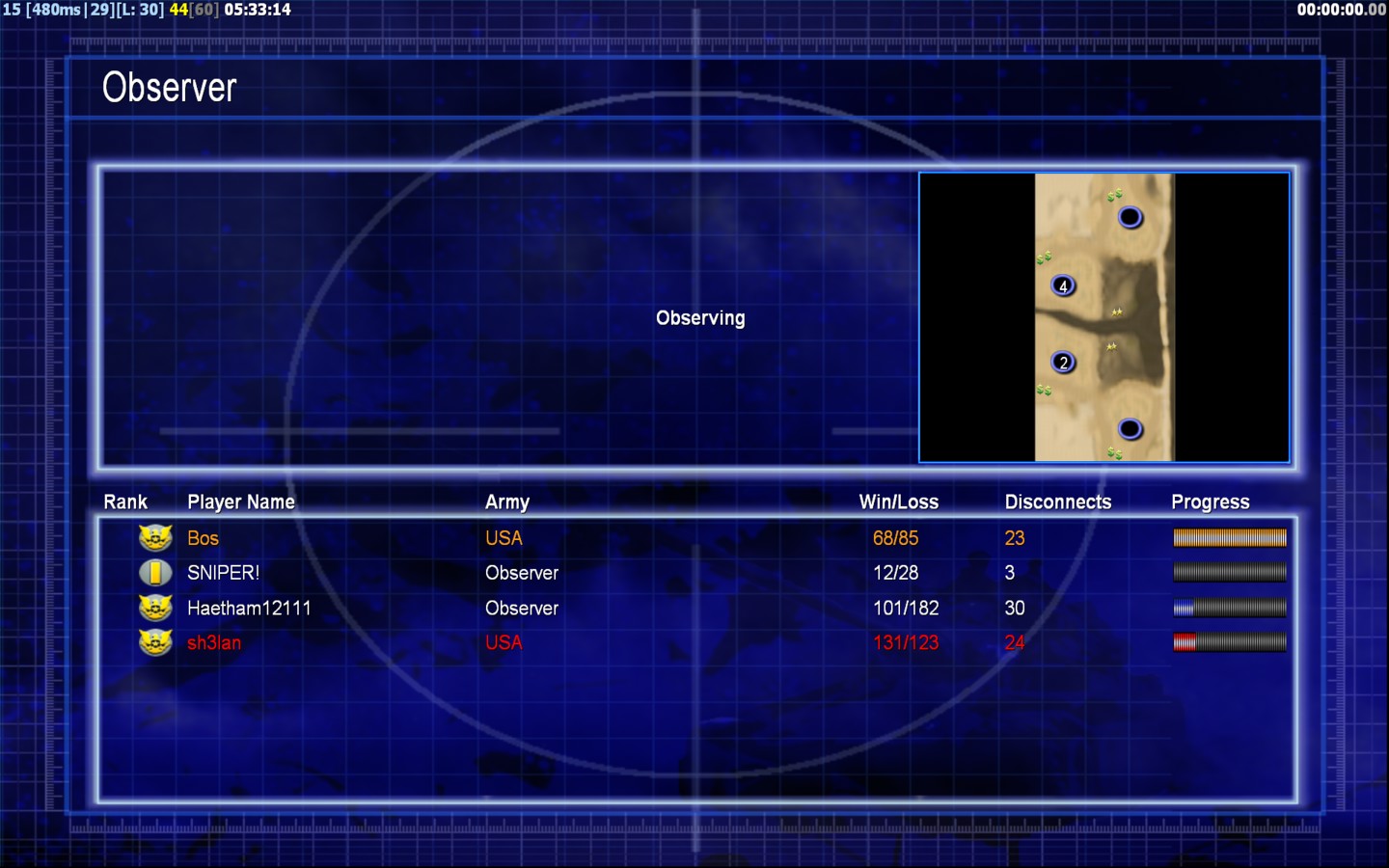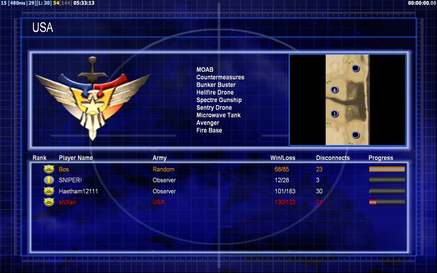 | NameSNIPER! | Side | Color | TeamNone | Starting PositionNone | Buildings Built0 | Buildings Lost0 | Buildings Destroyed0 | Units Built0 | Units Lost0 | Units Destroyed0 | Money Earned0 | OutcomeLost |