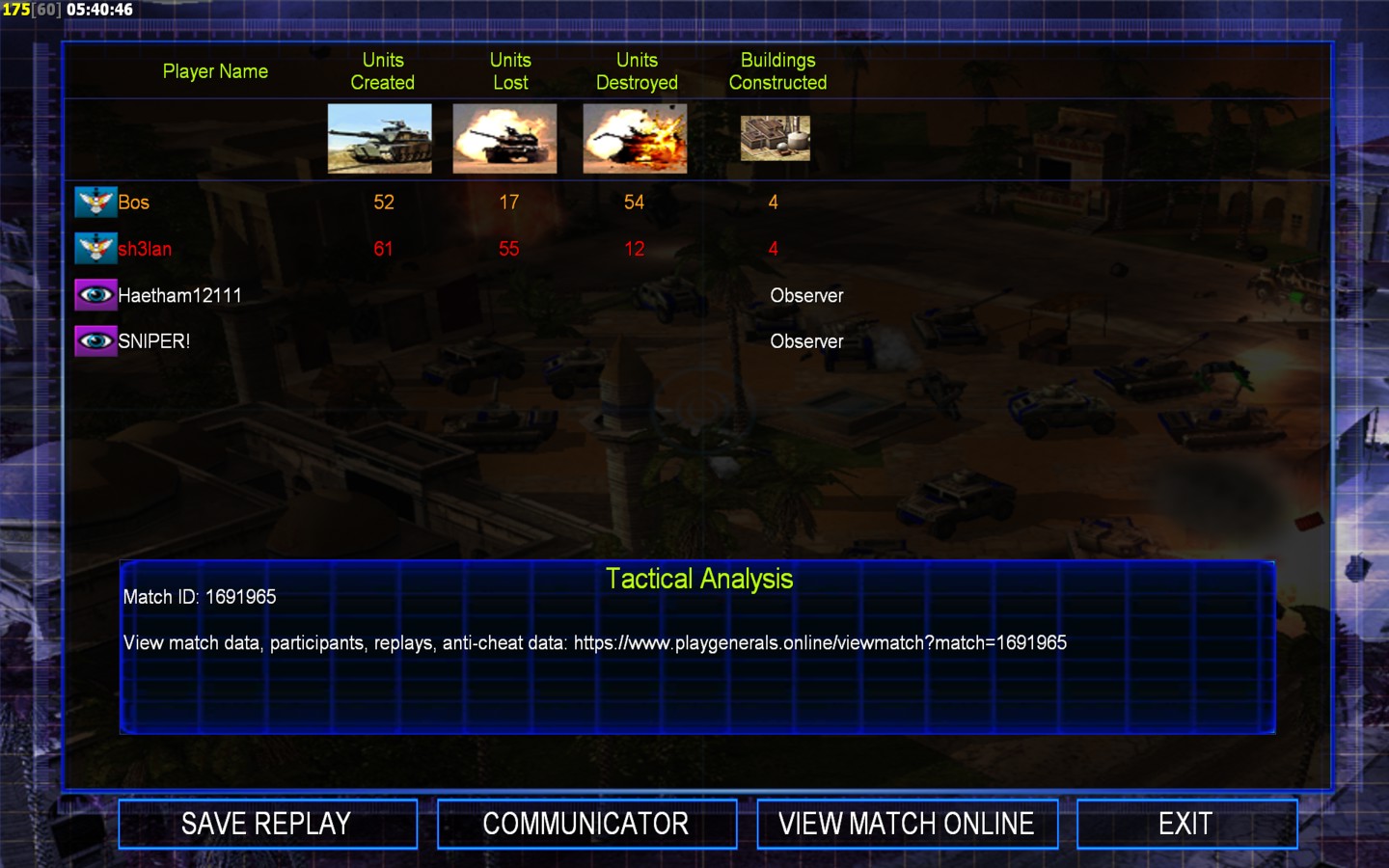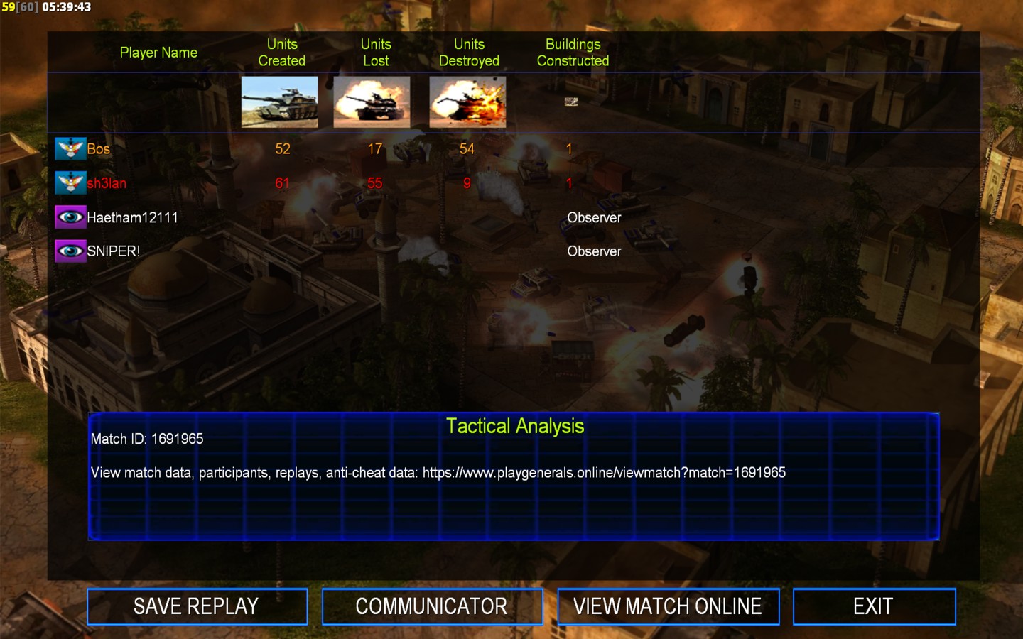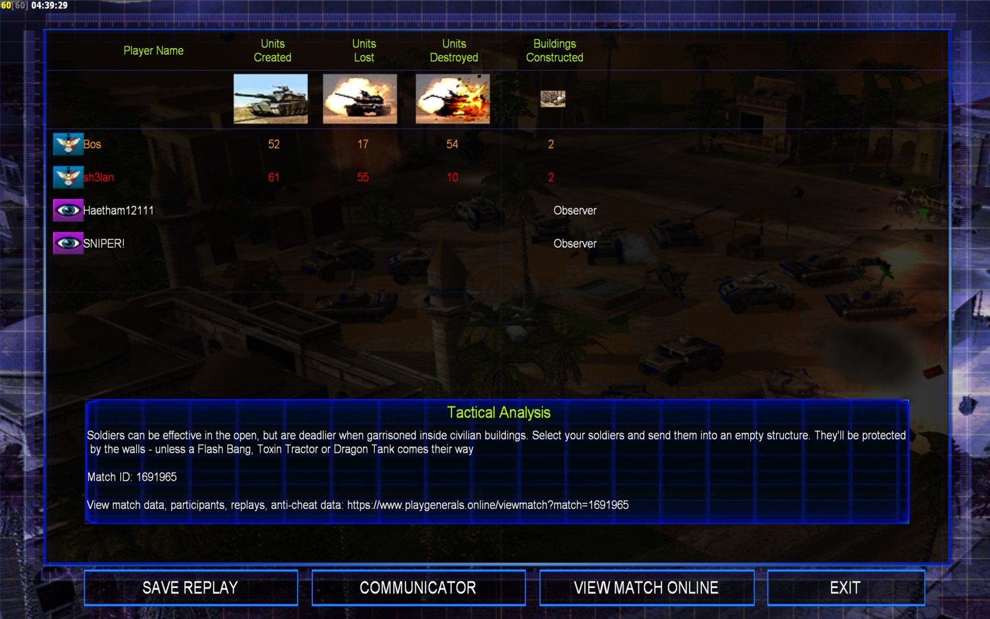 | Namesh3lan | Side | Color | TeamNone | Starting Position0 | Buildings Built15 | Buildings Lost2 | Buildings Destroyed2 | Units Built61 | Units Lost55 | Units Destroyed17 | Money Earned24200 | OutcomeLost |