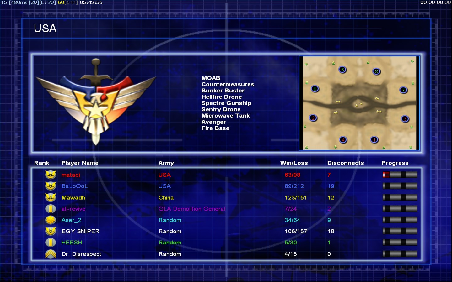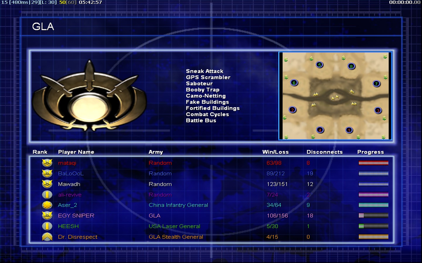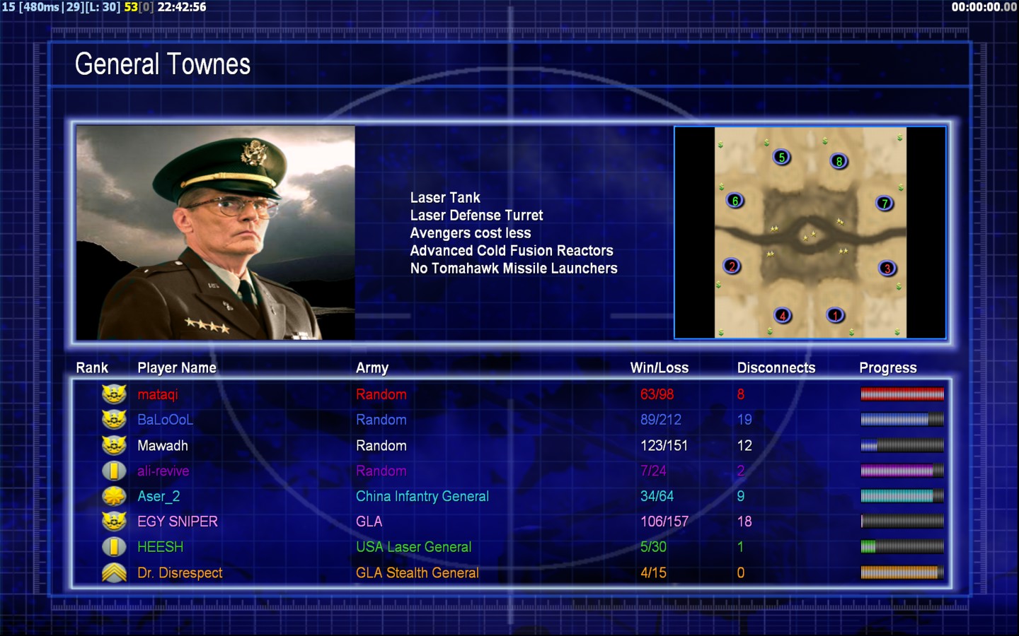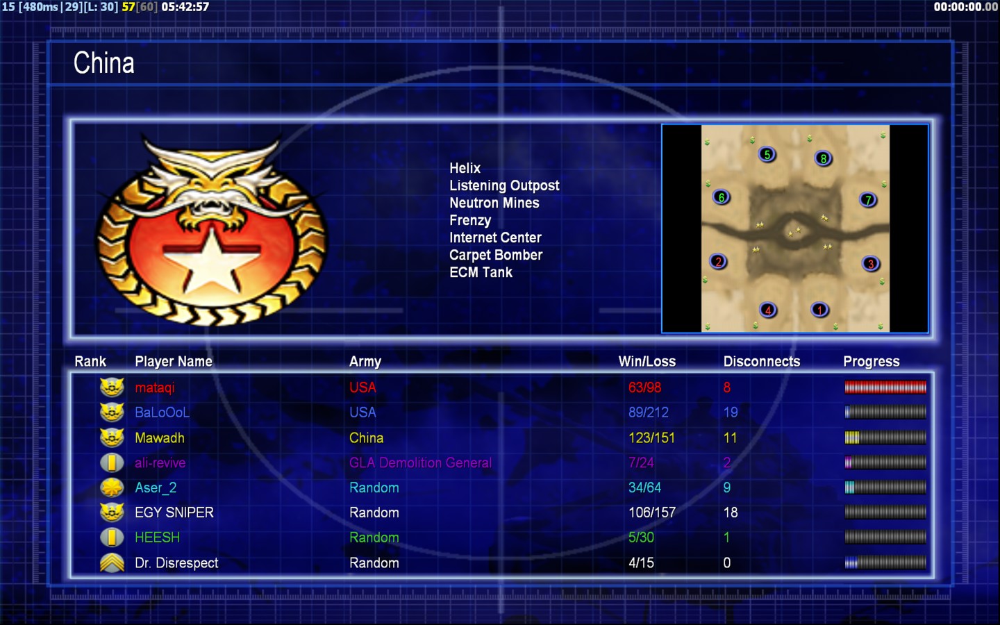 | NameDr. Disrespect | Side | Color | Team1 | Starting Position2 | Buildings Built1 | Buildings Lost0 | Buildings Destroyed0 | Units Built3 | Units Lost0 | Units Destroyed0 | Money Earned0 | OutcomeWon |