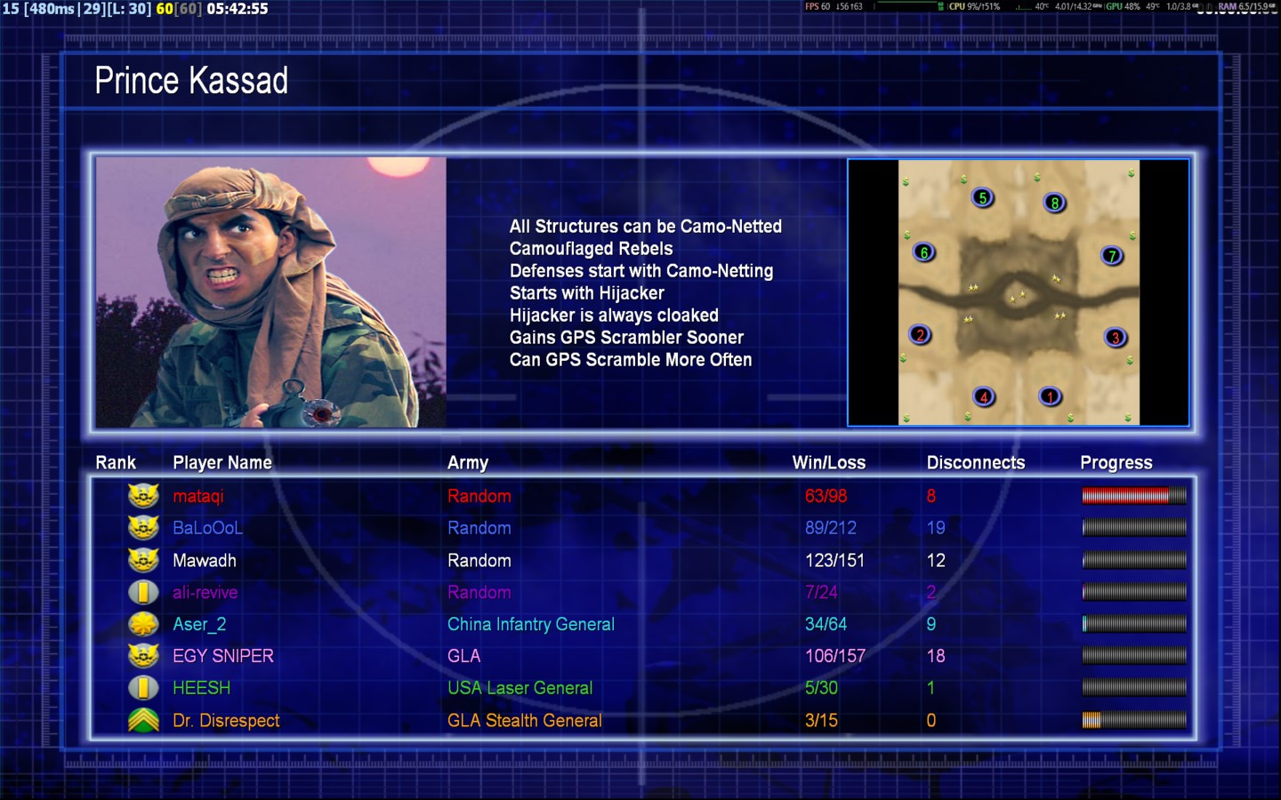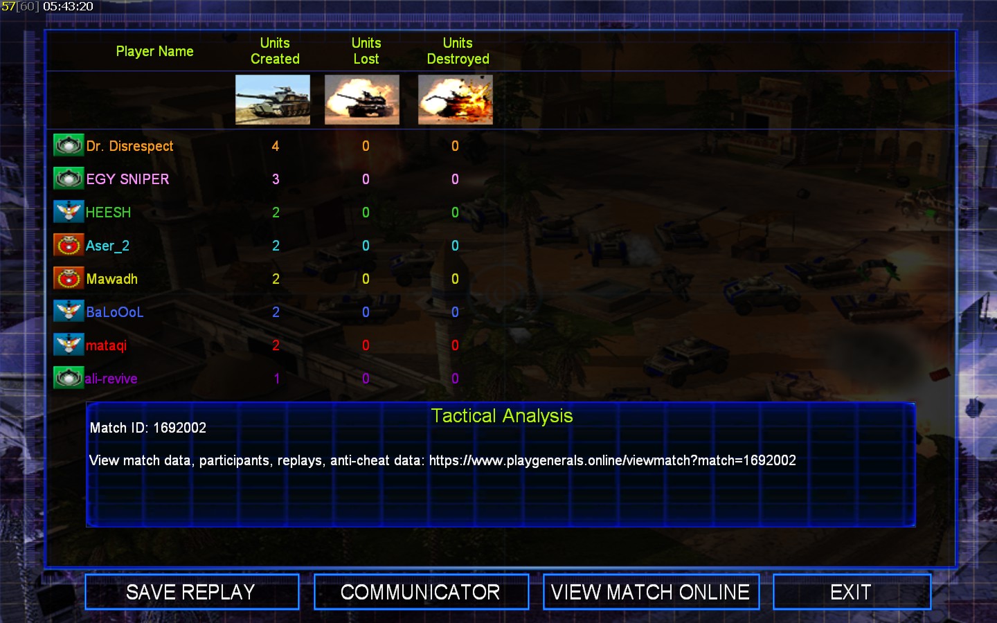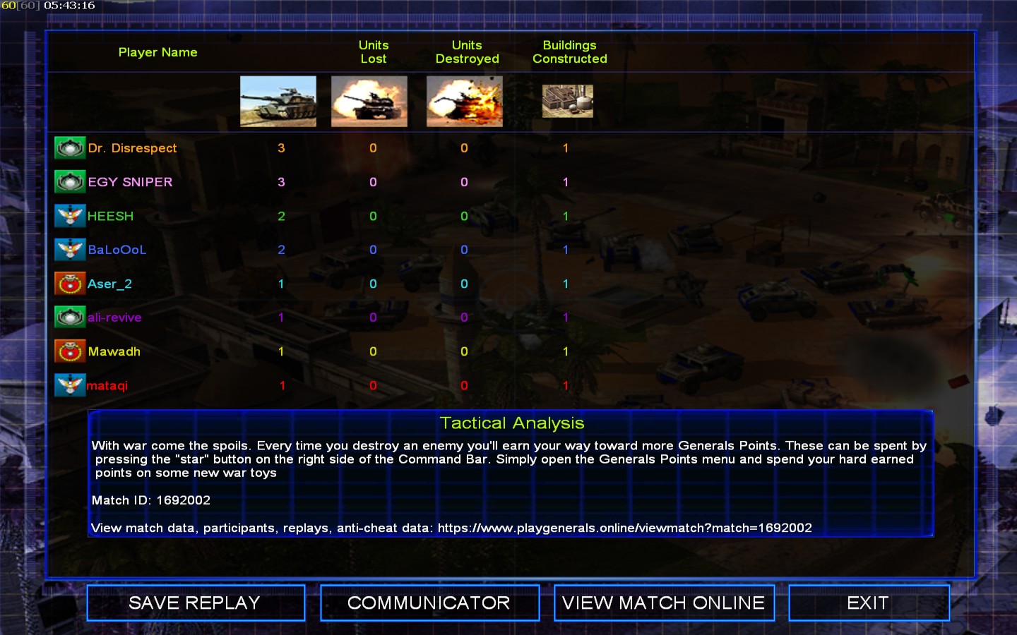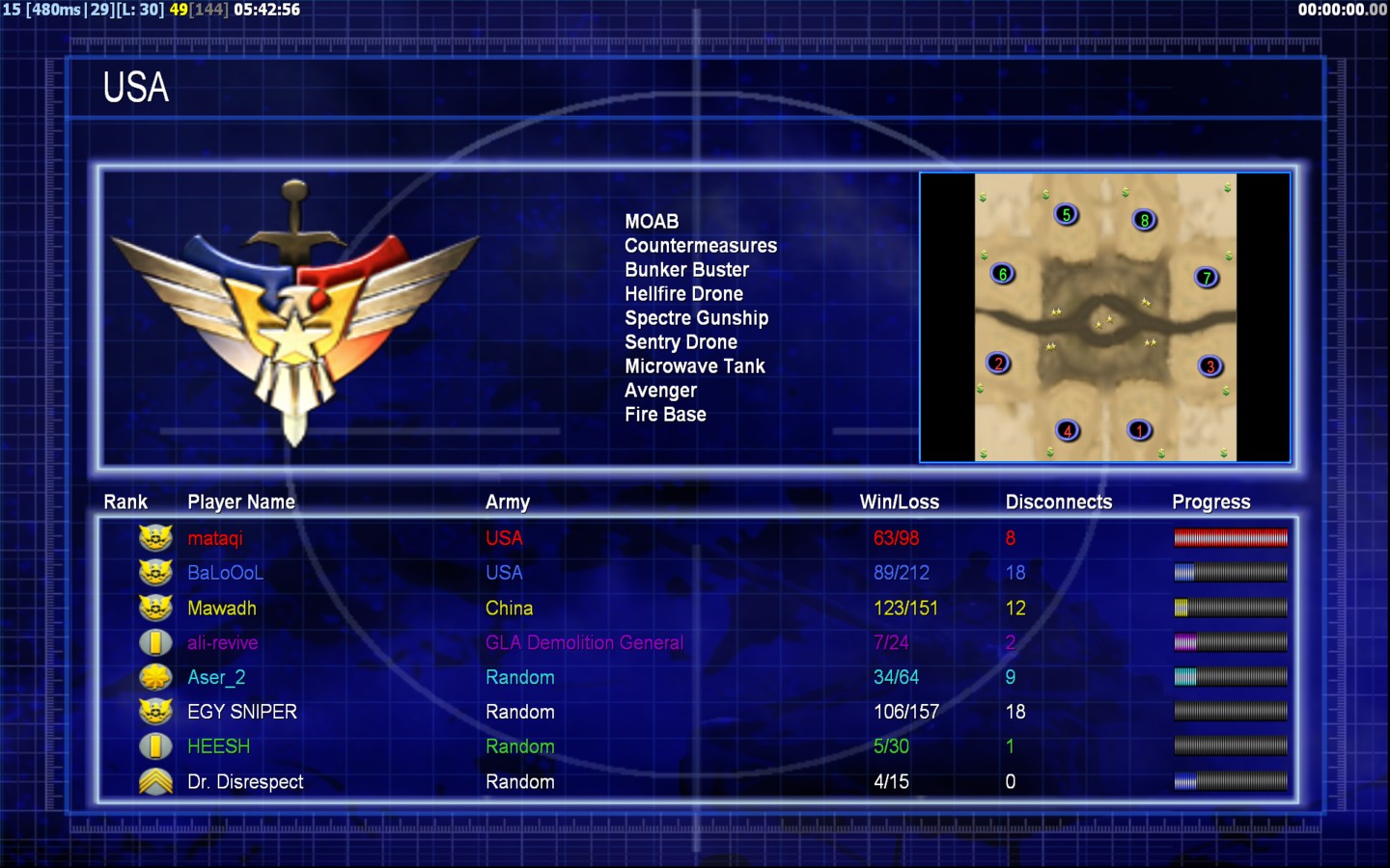 | NameDr. Disrespect | Side | Color | Team1 | Starting Position2 | Buildings Built1 | Buildings Lost0 | Buildings Destroyed0 | Units Built3 | Units Lost0 | Units Destroyed0 | Money Earned0 | OutcomeWon |