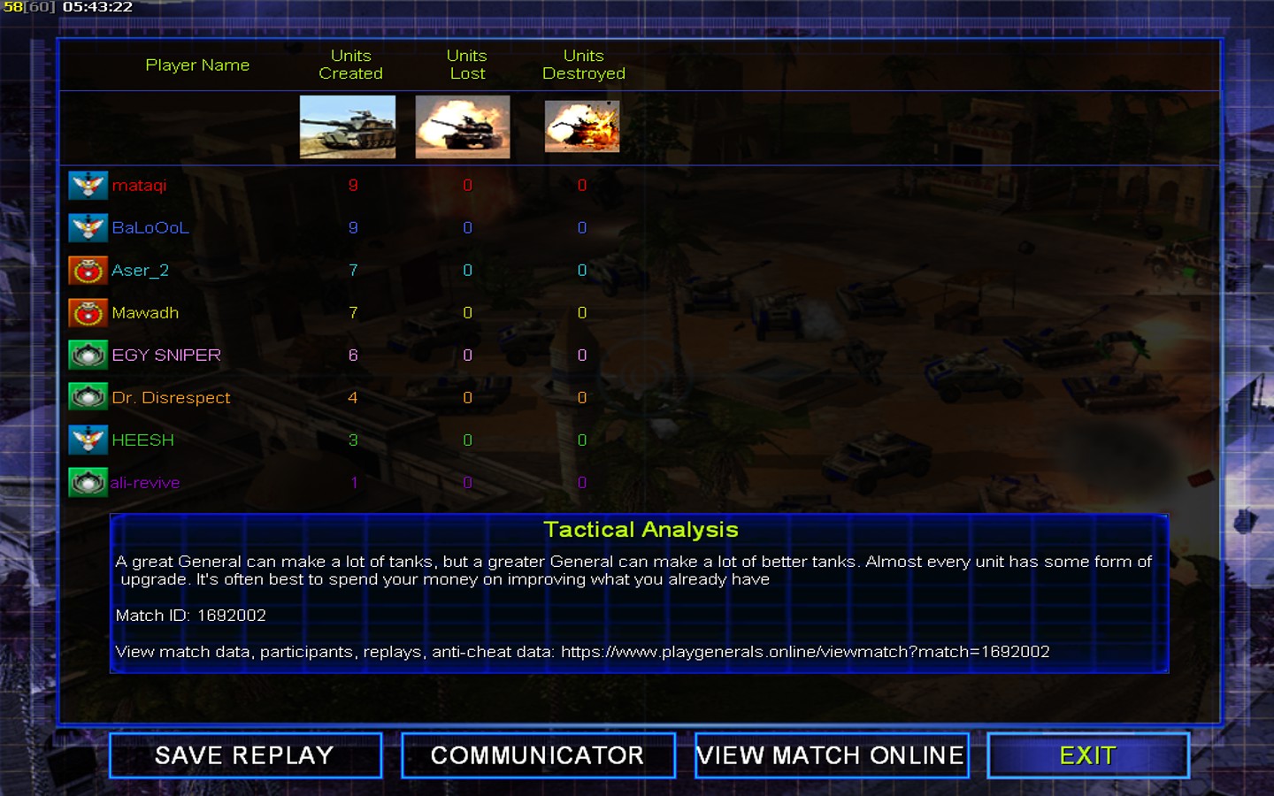 | Namemataqi | Side | Color | Team0 | Starting Position5 | Buildings Built1 | Buildings Lost0 | Buildings Destroyed0 | Units Built1 | Units Lost0 | Units Destroyed0 | Money Earned0 | OutcomeLost |