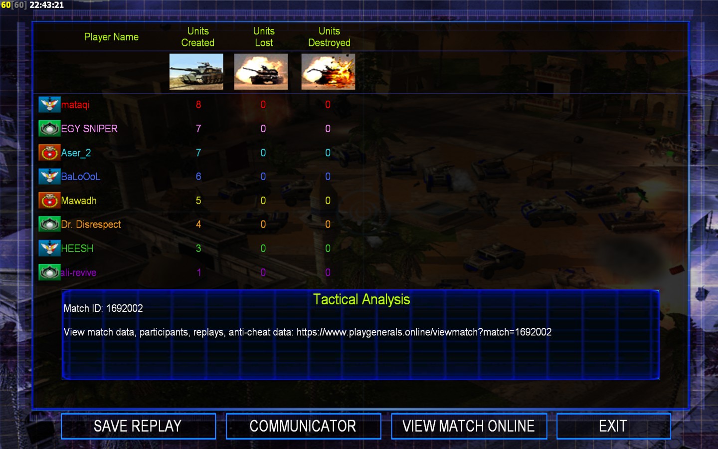 | NameMawadh | Side | Color | Team0 | Starting Position4 | Buildings Built1 | Buildings Lost0 | Buildings Destroyed0 | Units Built2 | Units Lost0 | Units Destroyed0 | Money Earned0 | OutcomeLost |
