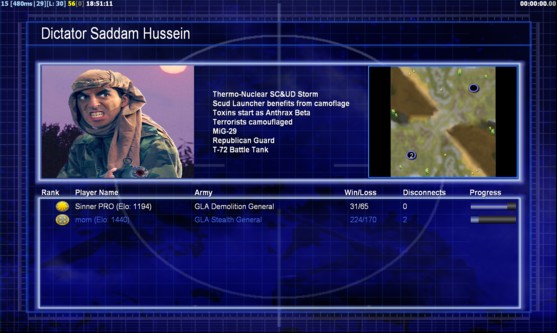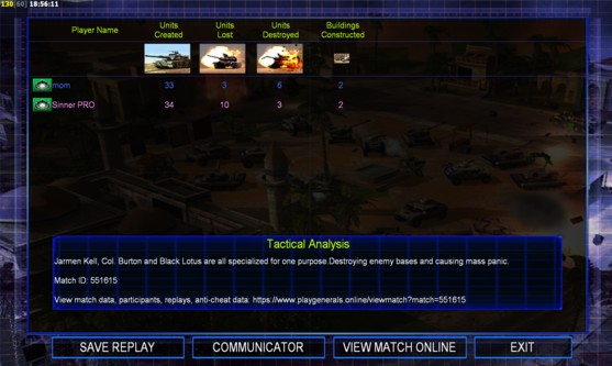 | Name | Side | Color | Team | Starting Position | Buildings Built | Buildings Lost | Buildings Destroyed | Units Built | Units Lost | Units Destroyed | Money Earned | Outcome |