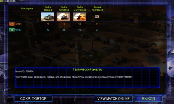 | Display Name | Side | Color | Team | Map Starting Position | Buildings Built | Buildings Destroyed | Buildings Lost | Units Built | Units Destroyed | Units Lost | Total Money Earned | Outcome |