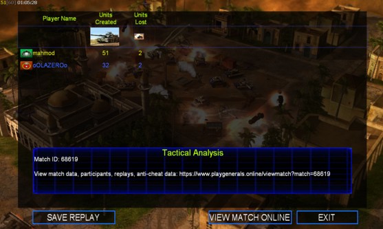 | Display Name | Side | Color | Team | Map Starting Position | Buildings Built | Buildings Destroyed | Buildings Lost | Units Built | Units Destroyed | Units Lost | Total Money Earned | Outcome |